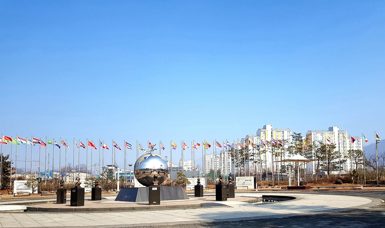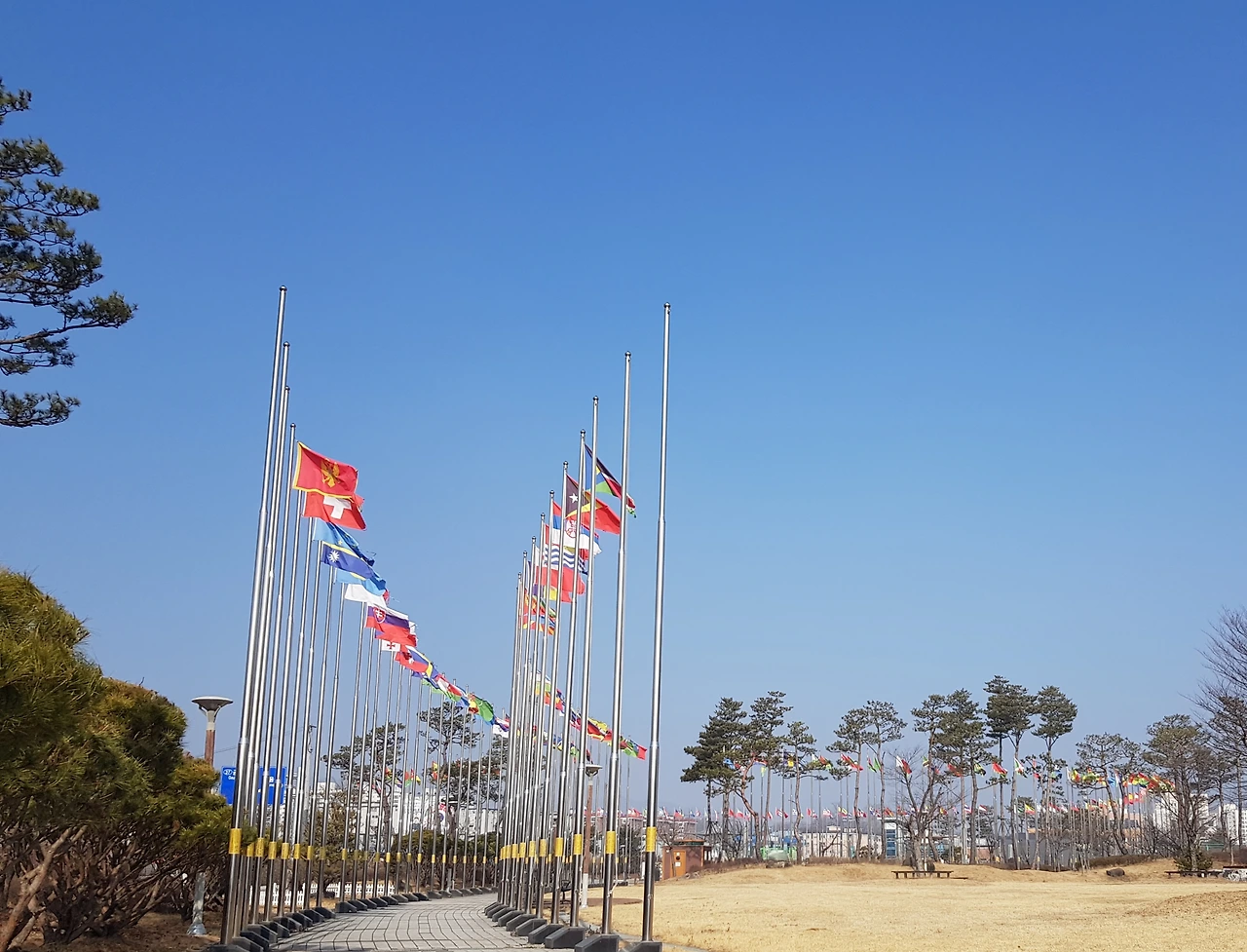 국기가 줄지어 있었고 국기 게양대 밑에 국가의 이름을 동판에 새기고 국기를 게양해 두어 아이들과 같이 온다면 현장학습이 잘 될 것 같았다