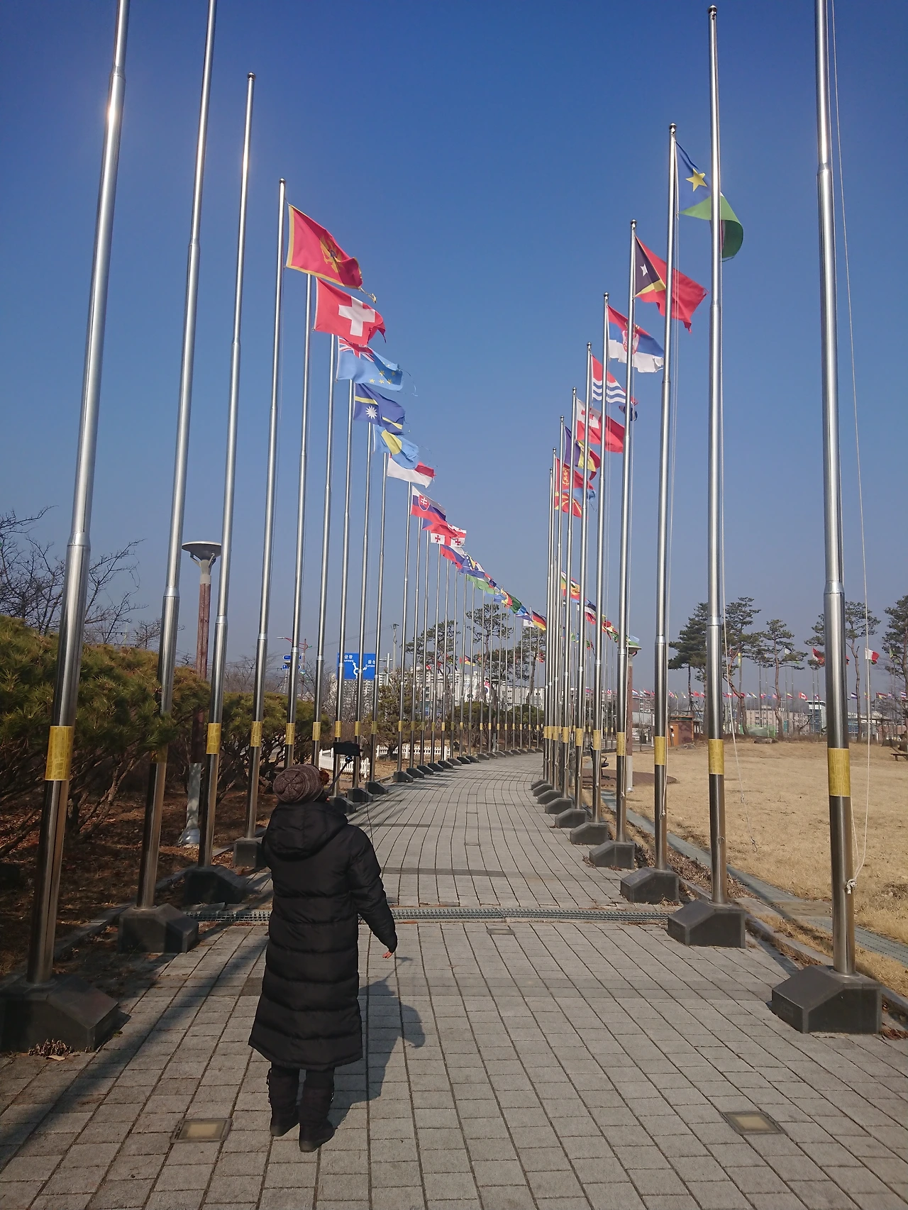 길 양옆으로 줄지어서 펄럭이는 국기들 사이를 걷는데