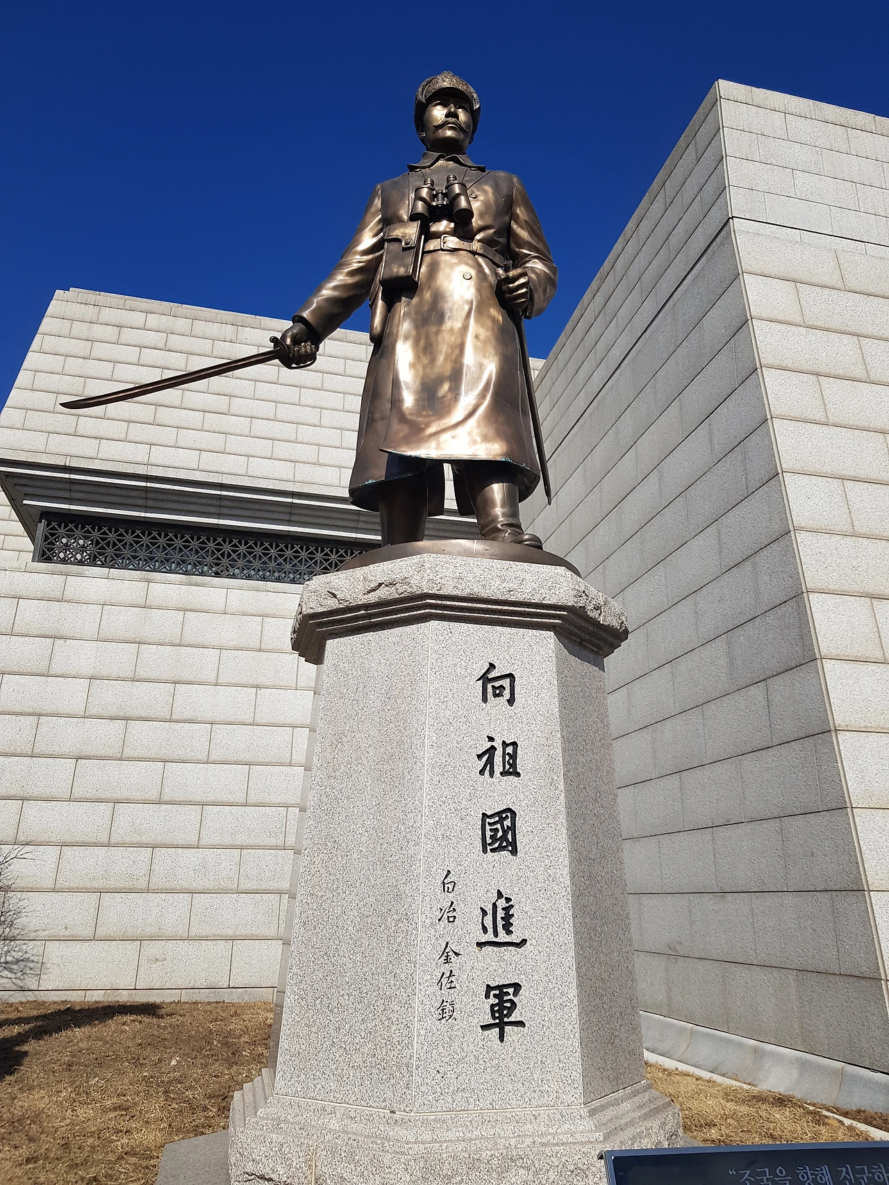 잠시 앉아 쉬며 동산에 비치된 작품을 감상한 후 내려가니 김좌진, 안중근, 윤봉길의 동상이 있었고 그 맞은편 쪽으로 비행기가 있어 가 보았다