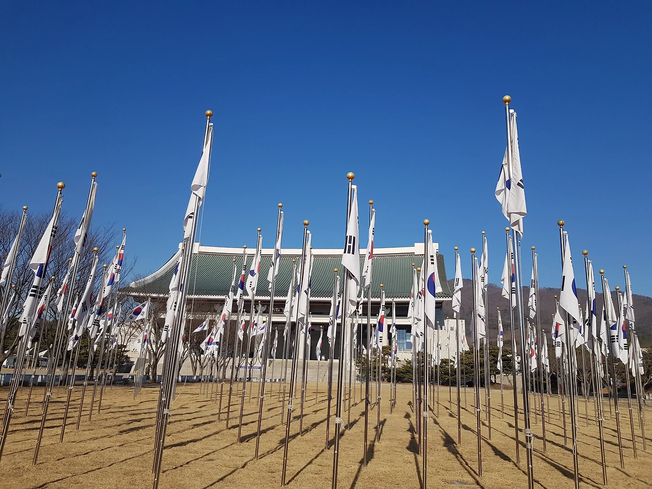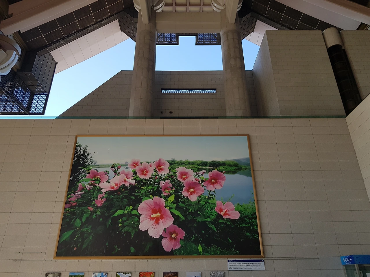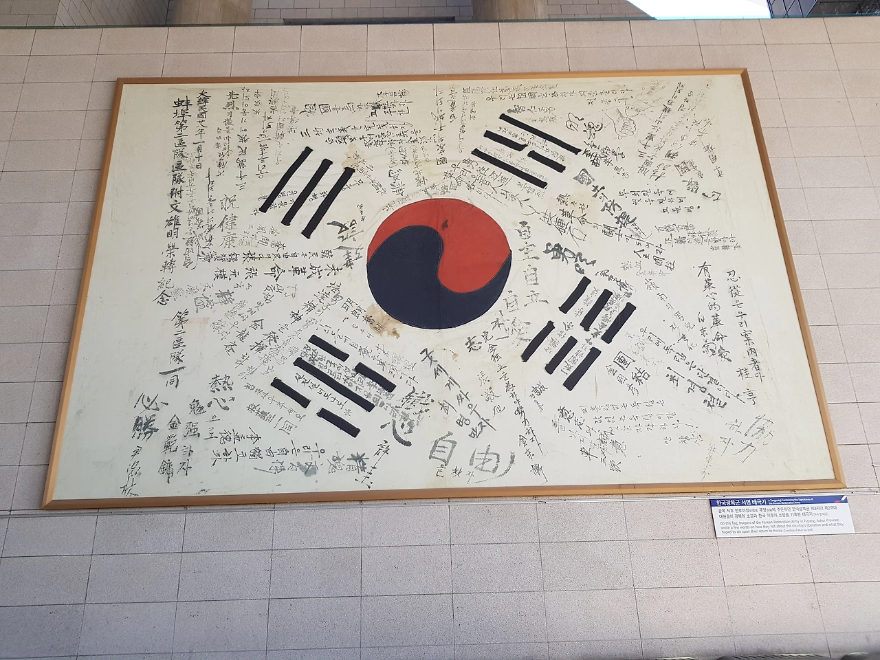 그 모습이 강렬해서 이리저리 한참을 감상한 후 옆 벽의 광복군들의 서명이 빼곡한 태극기를 보며 감사를 전하고 다시 돌아 무궁화 그림 옆으로 빠져나간다