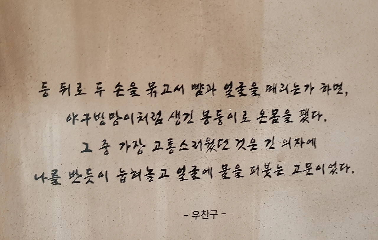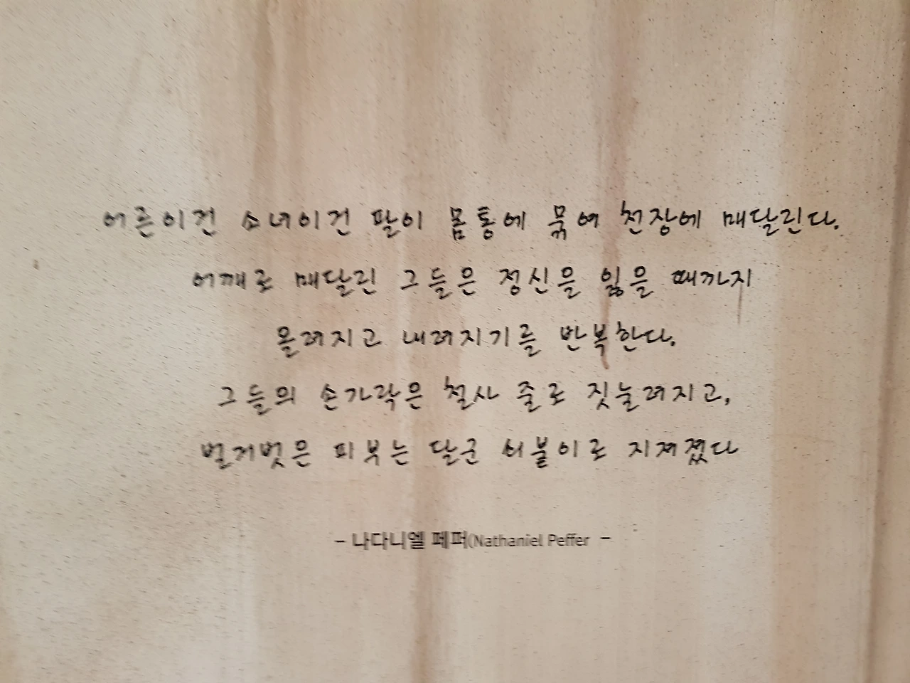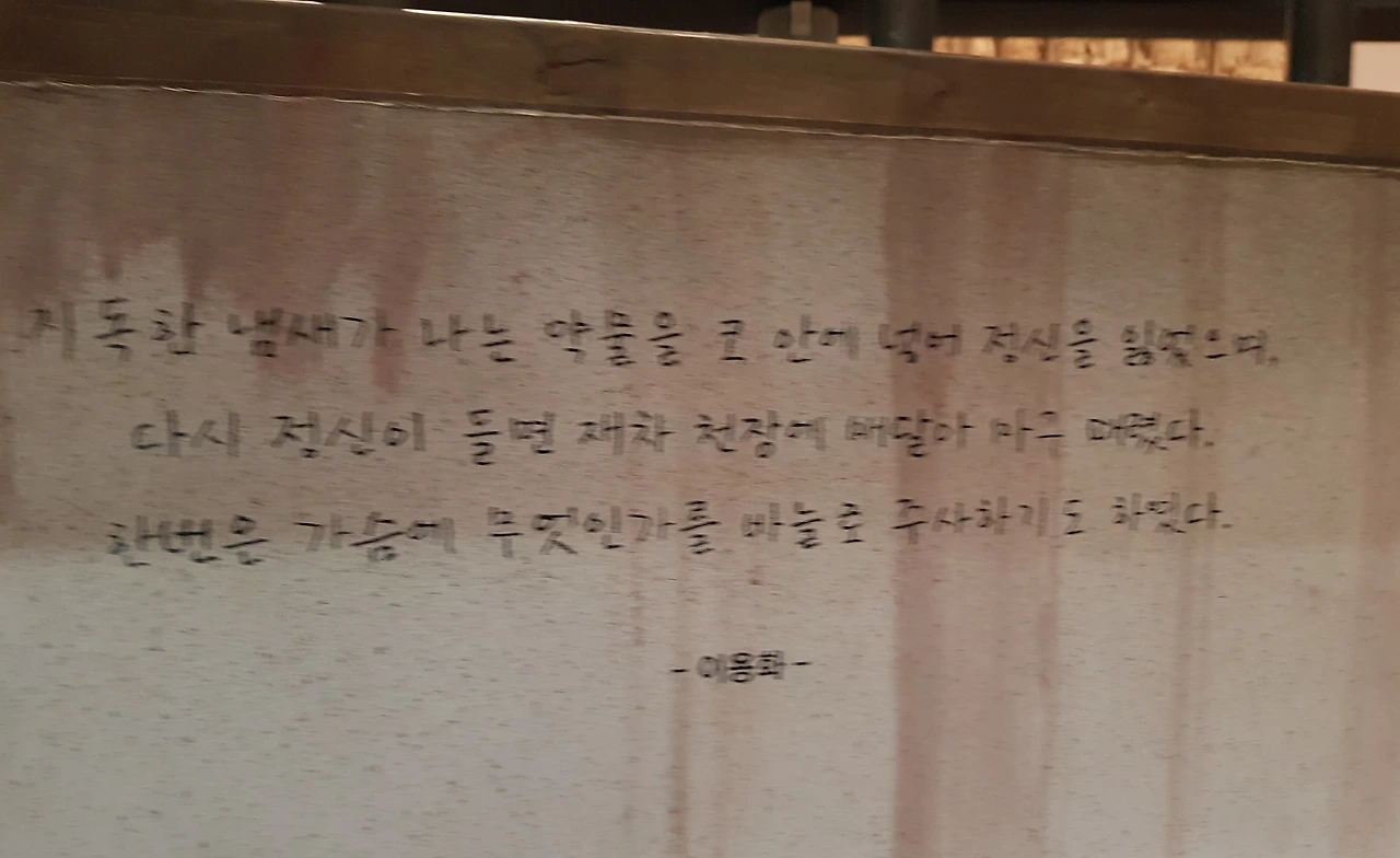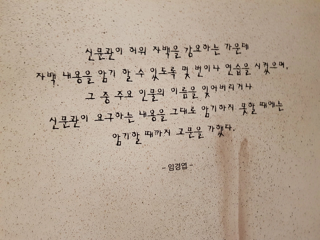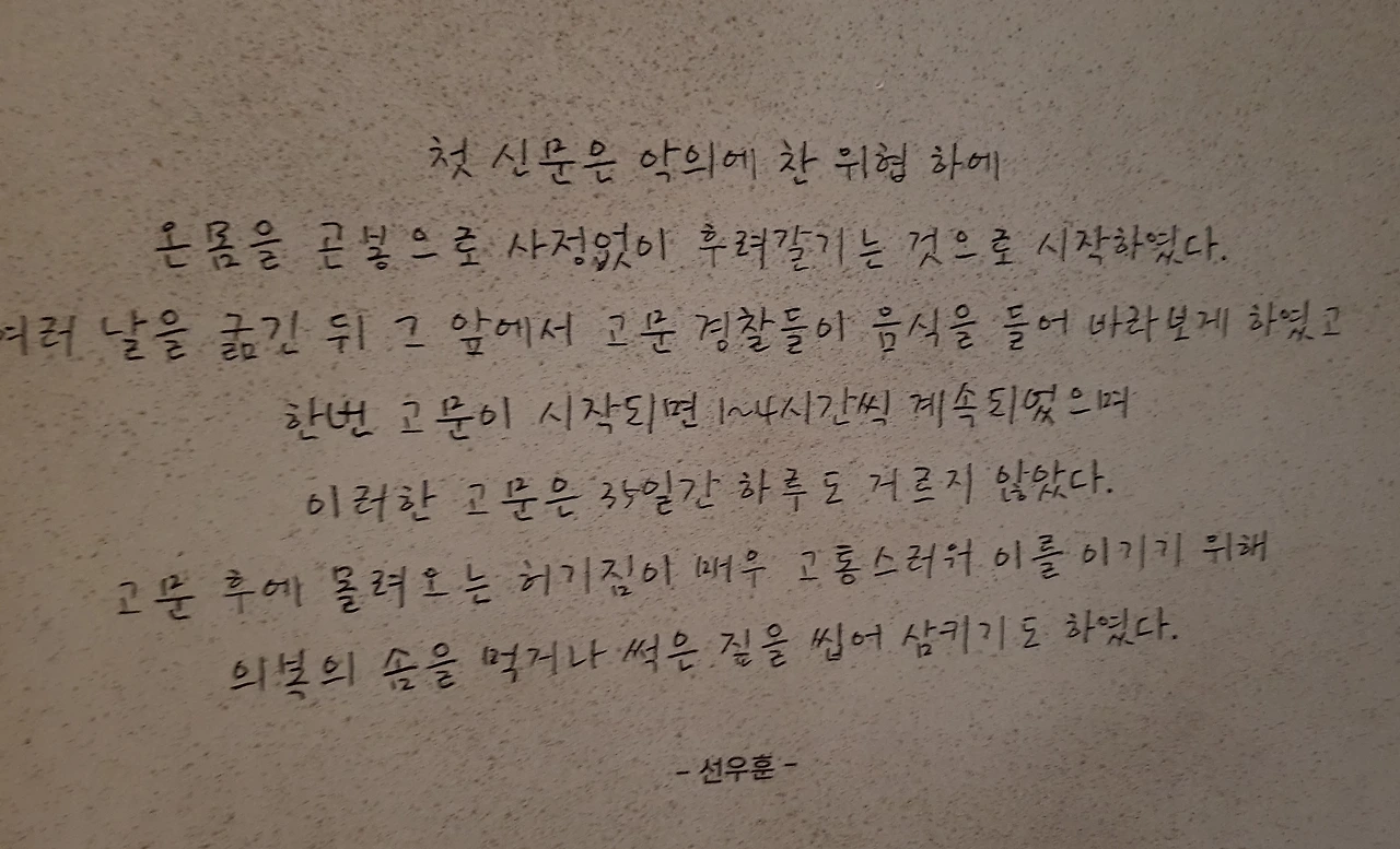 독립군들이 감옥의 벽에 섰다는 글들을 천천히 읽어보며 그 고통이 얼마나 지독했는지 온 몸이 떨리며 가슴이 아팠고 다른 어떤 전시물보다 지독하고 악랄한 고문에 몸서리치는 그분들의 고통이 내게도 전해지고 있어