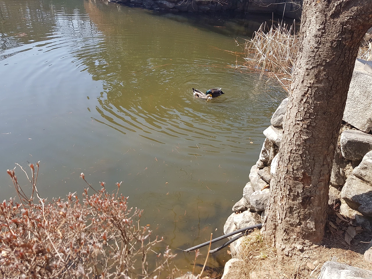수컷 오리 또 한 마리 경쟁자 밀어내려 꽥꽥꽥