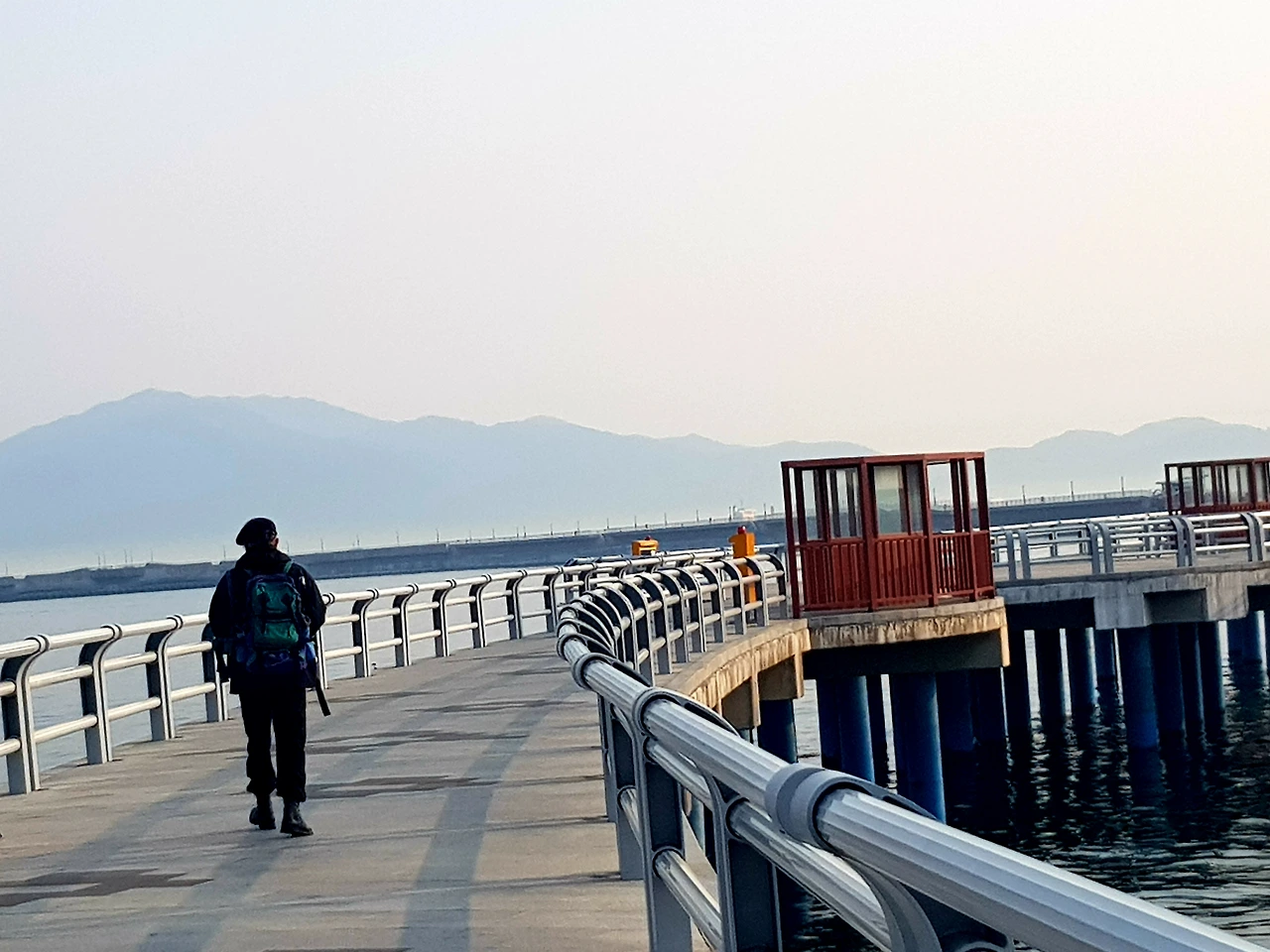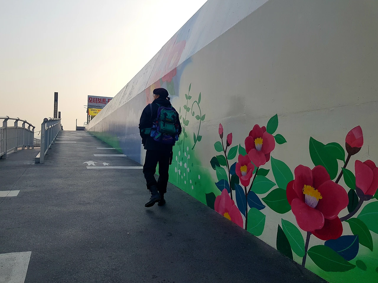 예쁜 꽃그림 장식과 바다 위 걷는 길도 부르는 약 800m의 오동도 방파제 길을 걷는다