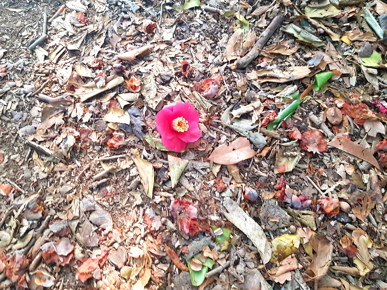 동백꽃을 실컷 보고 돌아 나오는 한 곳에 바닥에 빨간 동백한송이가 뚝 떨어져 있다