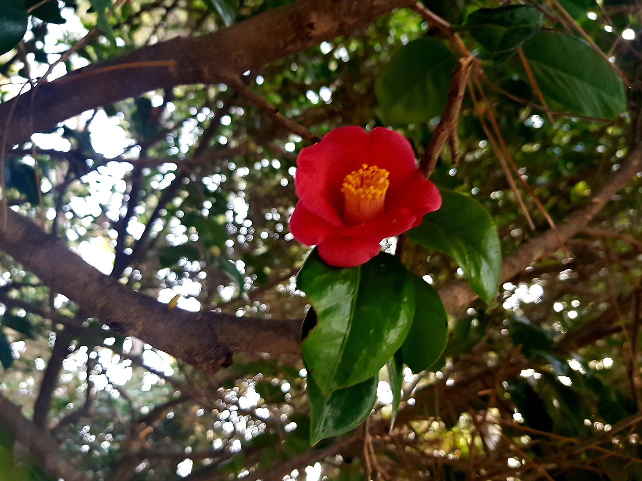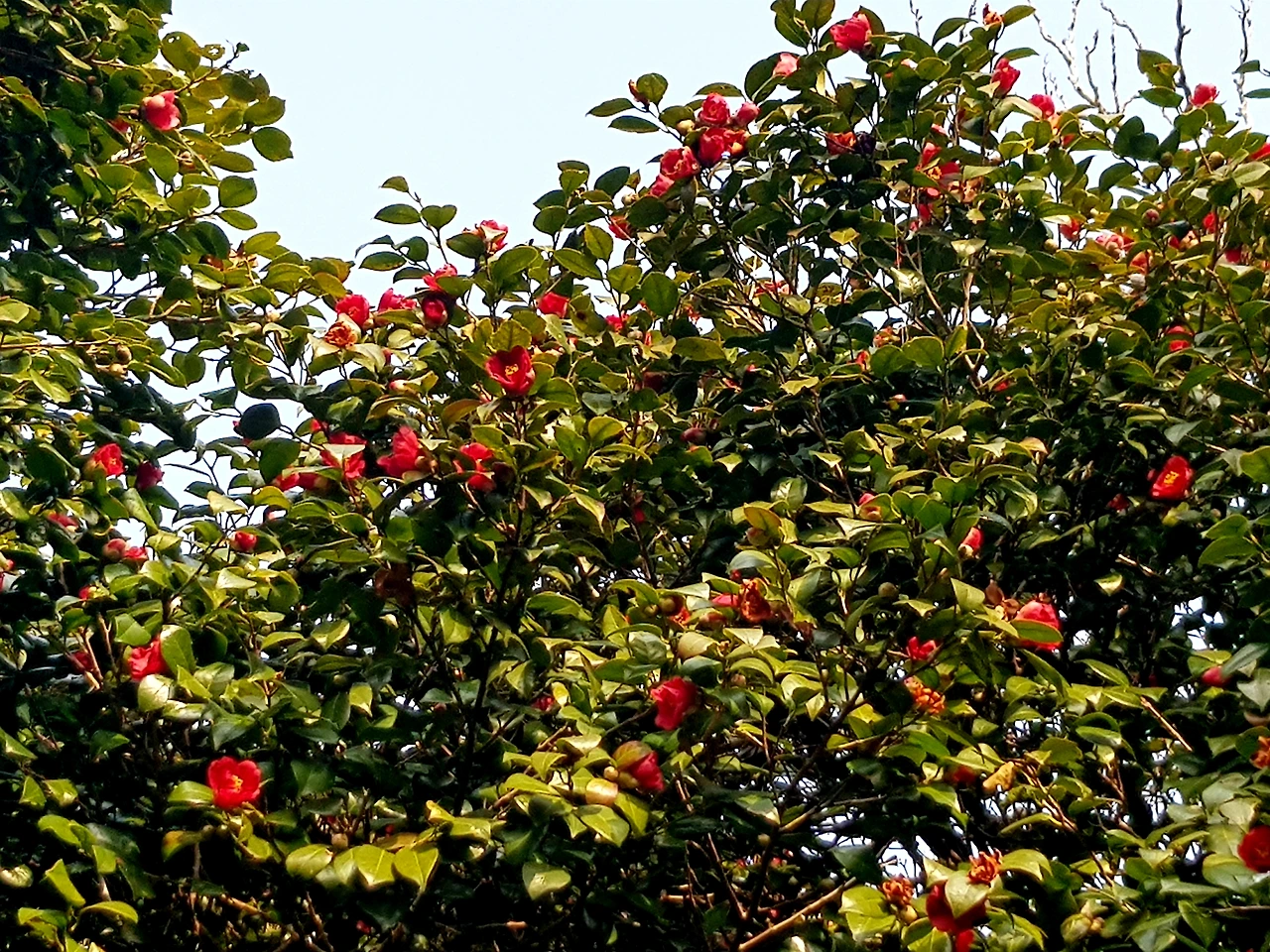 너무 큰 키의 동백나무는 저 하늘 높이에 빨간 꽃이 피어 고개를 되로 꺾고 인사했다