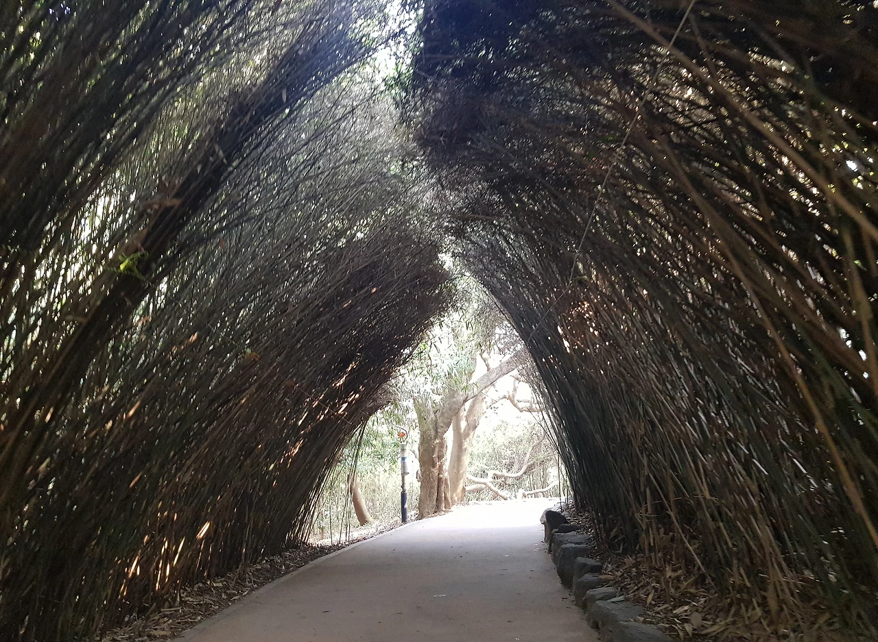 등대전망대에 올라 넘실대는 물결의 남해바다를 내려다보고 내려와 걷는데 인위적으로 만들어 놓은 대나무 터널을 지나 진짜 동백꽃을 자랑하는 동백전망대로 향했다