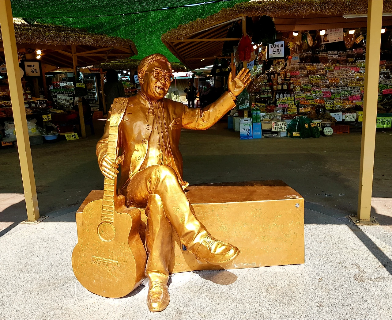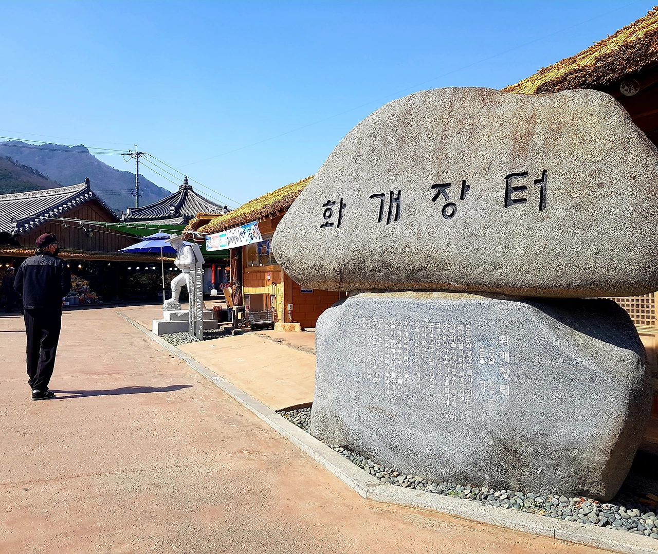 ㅡ화개장터 어서 오이소ㅡ라는 인사를 받으며 들어서니 돌이름표랑 황금조영남 동상은 변함이 없고 입구쯤에 자리 잡았던 지역 할머니들 장터가 보이지 않는다