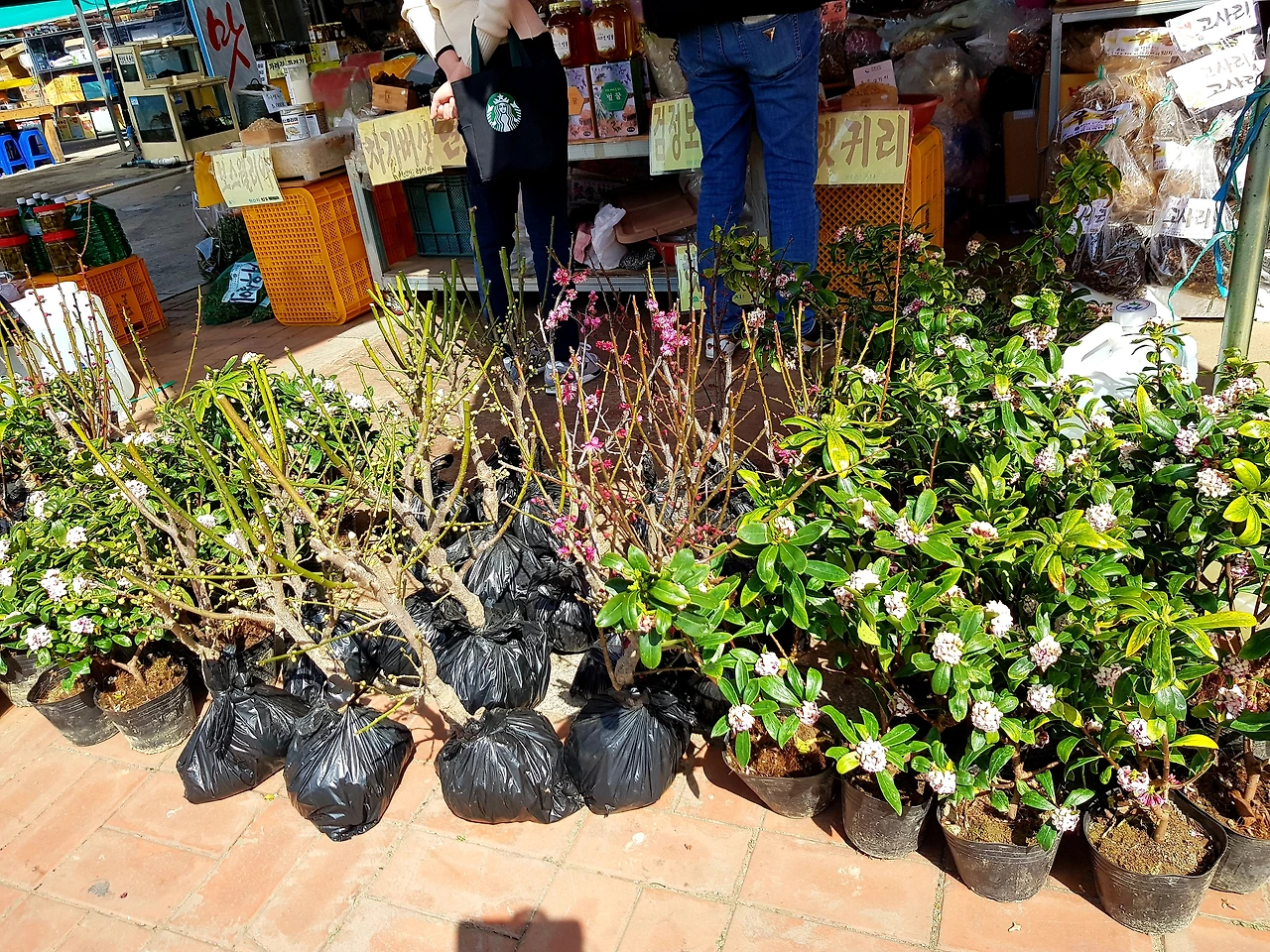 옆으로 가자 화초가계에 꽃이 핀 아기매화가 있어 화초사랑 짝꿍 발길 잡혀 서서