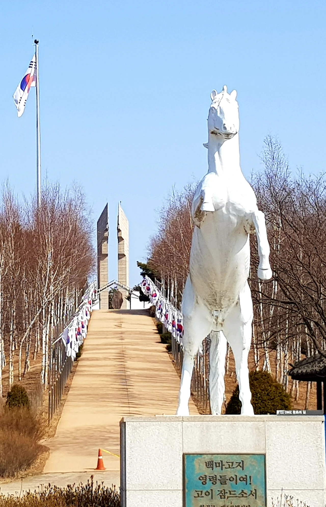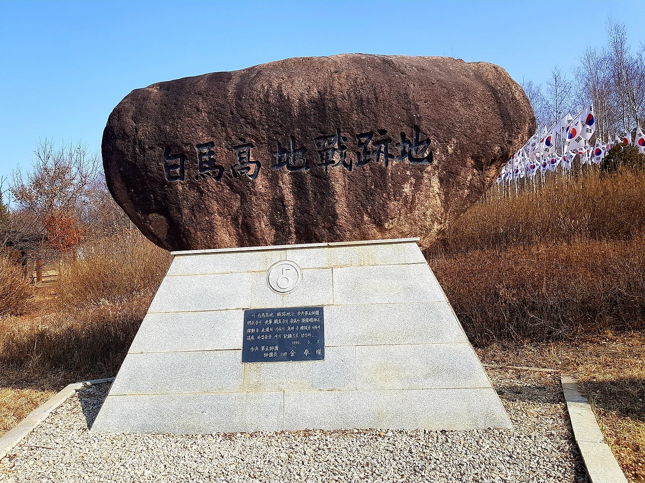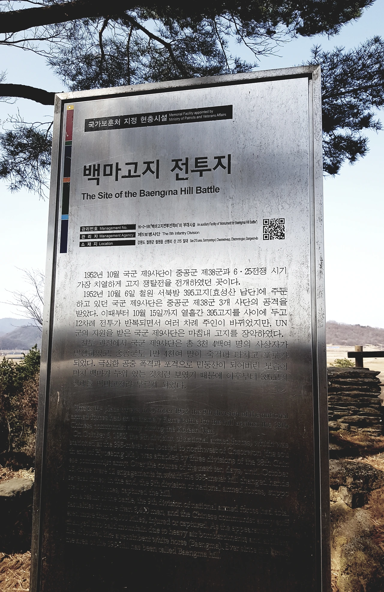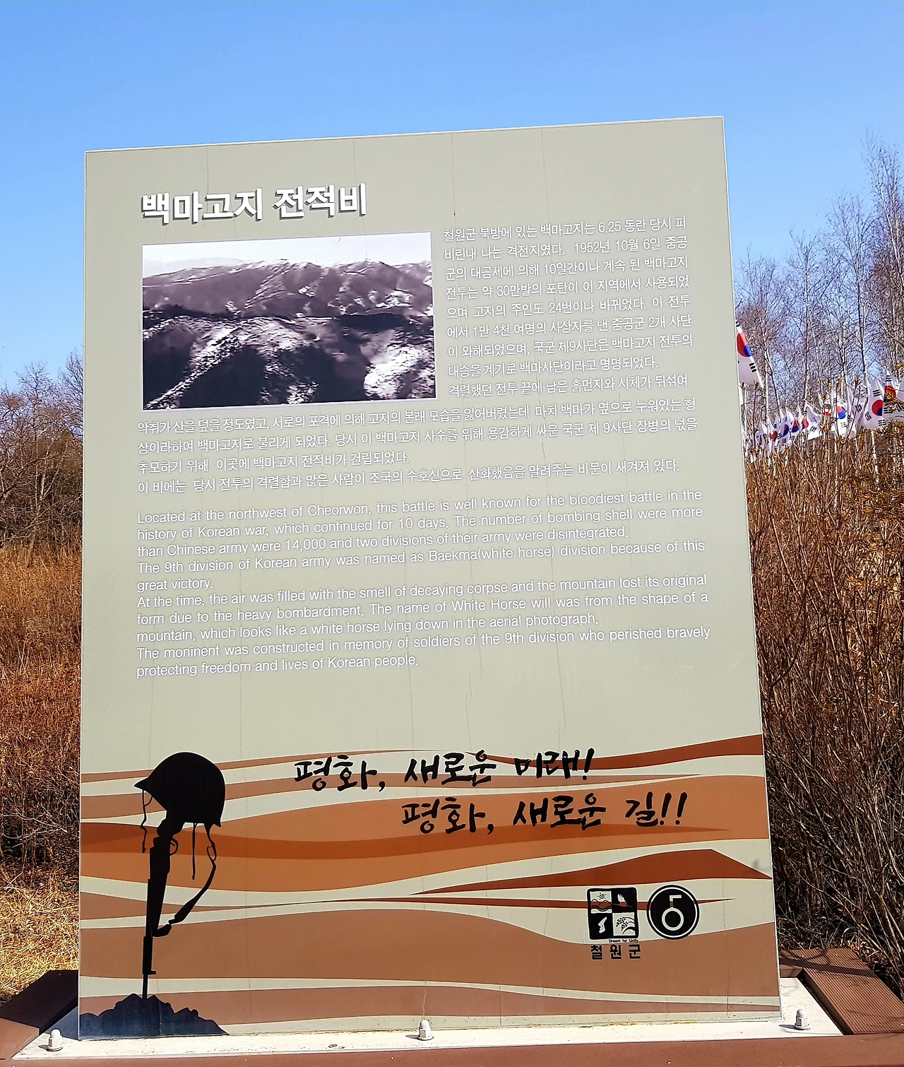 이 엄청나게 쏟아진 포탄으로 인하여 산 허리가 허옇게 드러났고 멀리서 보면 백마 한 마리가 드러누운 모습으로 보인다 하여 백마고지라 기자들이 전쟁 상황을 전송하기 시작하며 백마고지라는 이름이 자연스레 붙여졌다고도 한다는 공부를 하였기에 백마고지 전적지를 대하는 마음이 숙연 하였다