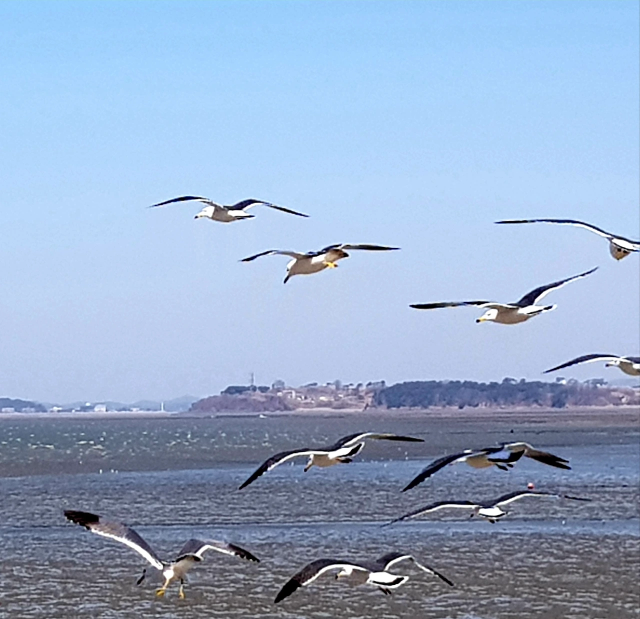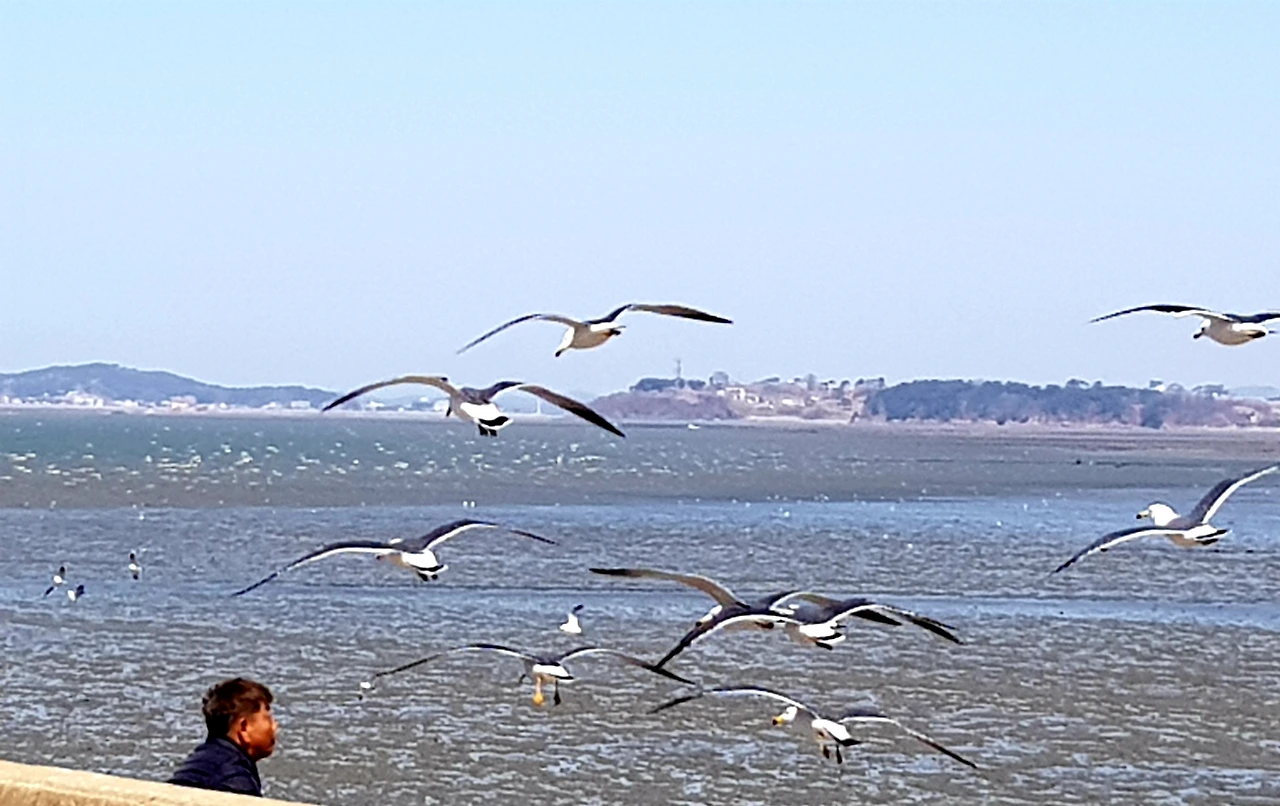 낙조길을 돌아 나오니 바닷가에 갈매기떼가 한 곳으로 날아들어 셔터를 누르며 살펴보니 아저씨 한분이 먹이를 주고 있는 모습이 보인다
