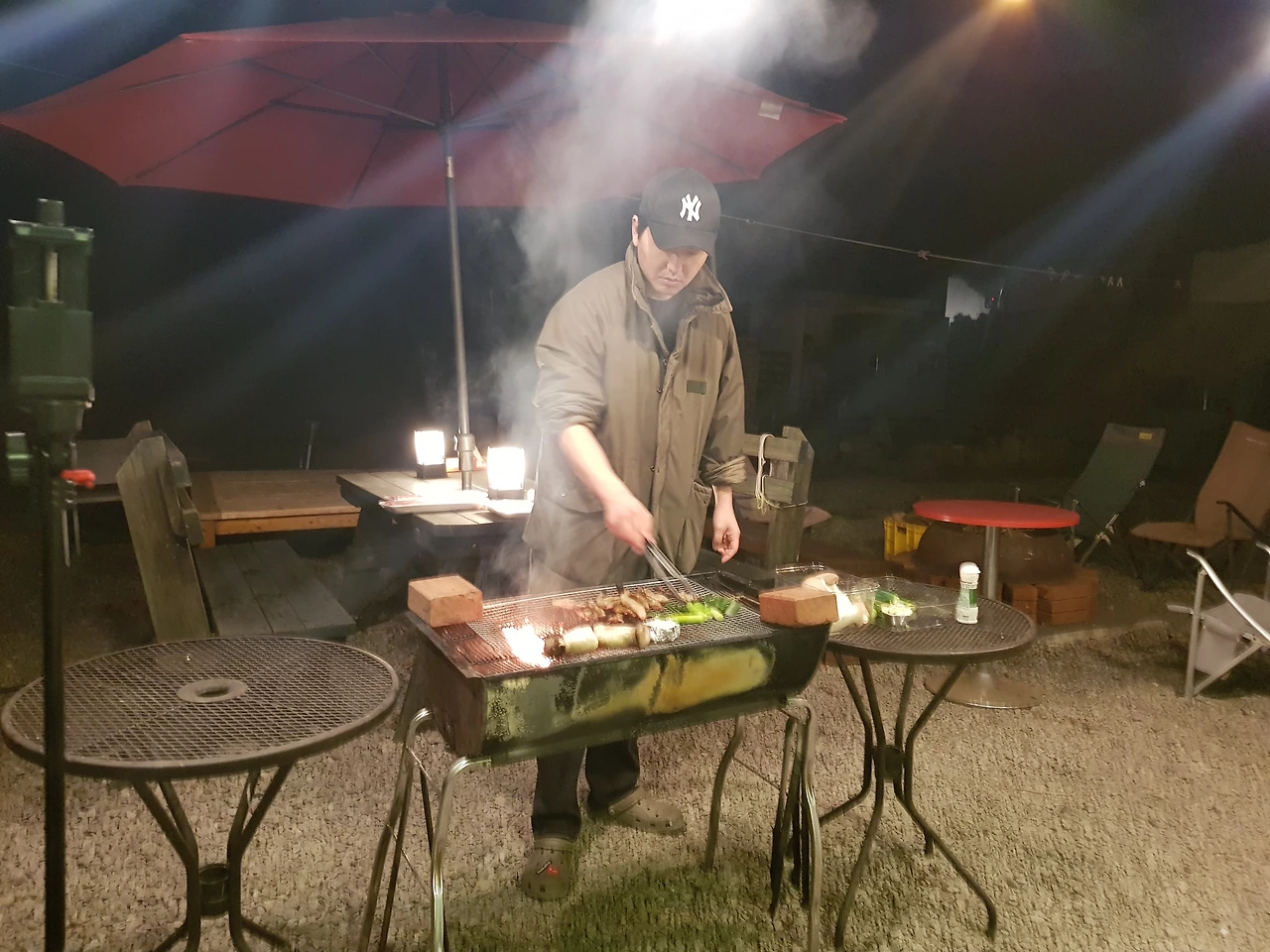 집을 돌아보고 준비한 회를 먹으며 파티는 시작되고 어둑어둑 어둠이 내리자 아들은 장작불에 고기구이를 시작하고 안마당에서 바깥 마당 바비큐 식탁으로 자리를 옮겼는데 며느리는 풍성한 식탁을 차려 온 가족이 함께하며 여유를 즐기는 시간이 되고