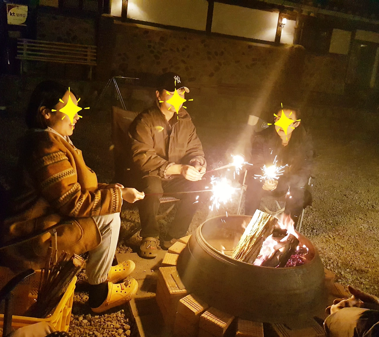 식사 후 어둑해진 앞마당에 캠프 화이어가 시작되었다