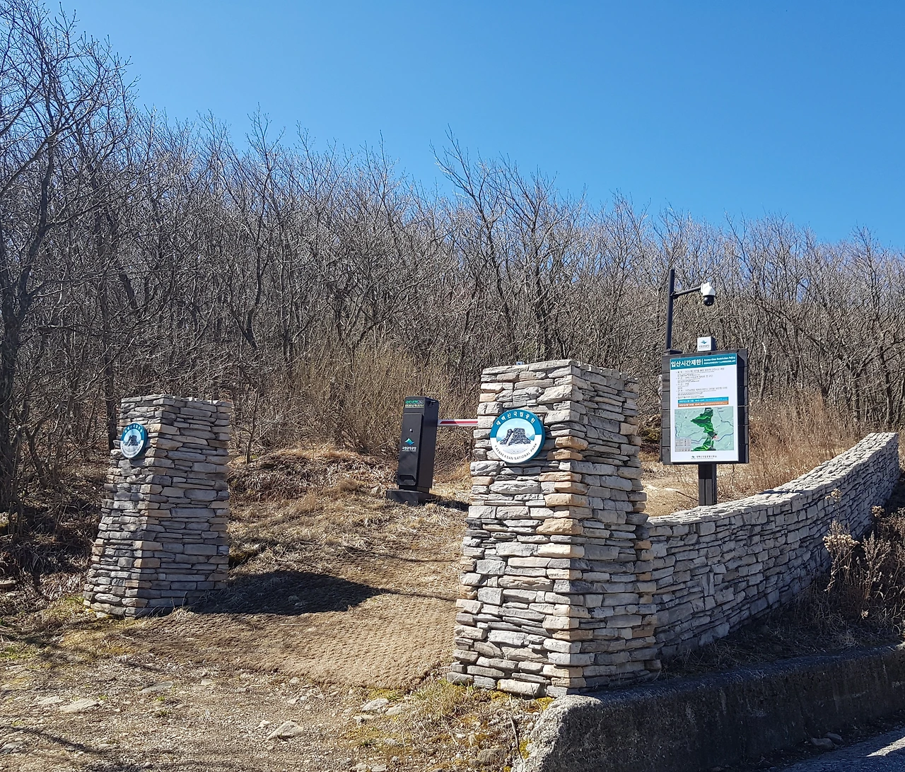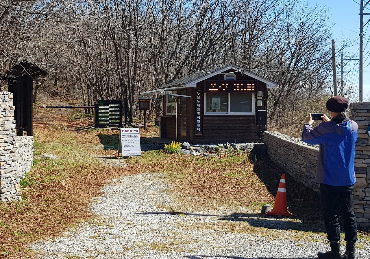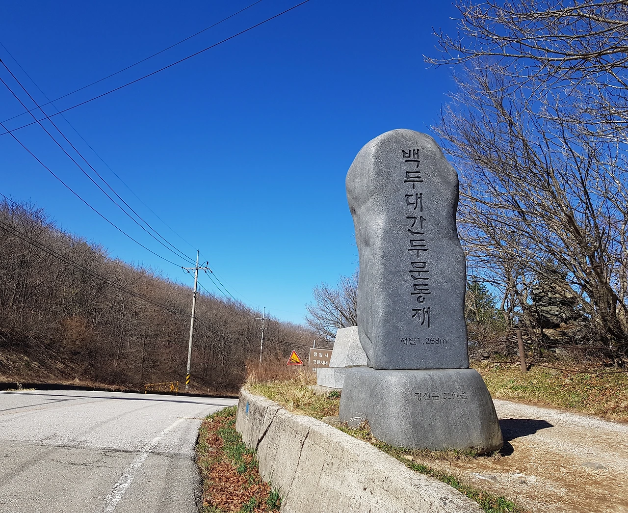 백두대간 두문동재 해발 1268m라는 돌비가 우뚝 서 있고 두문동재 탐방지원센터와 맞은편에 함백산 쉼터가 있고 그 위쪽으로 태백산 국립공원을 알리는 입구도 있었다