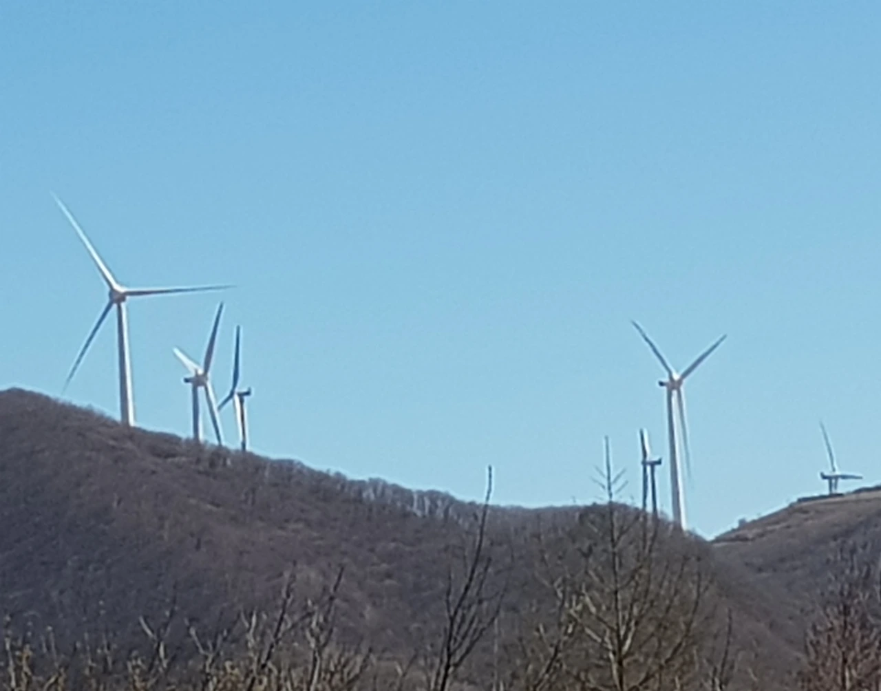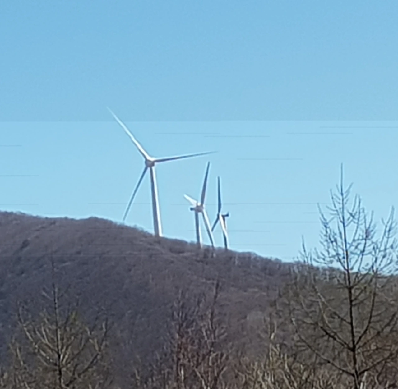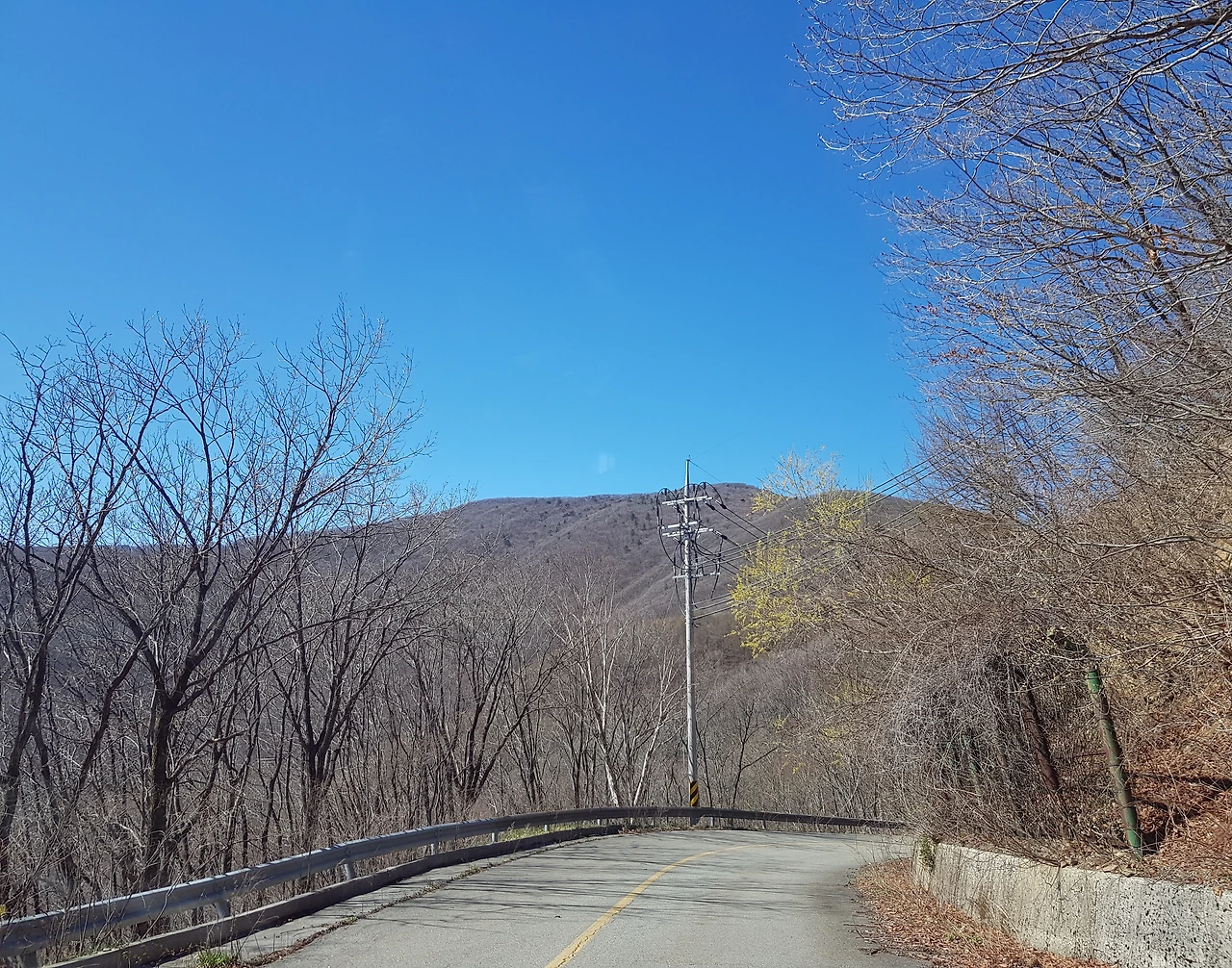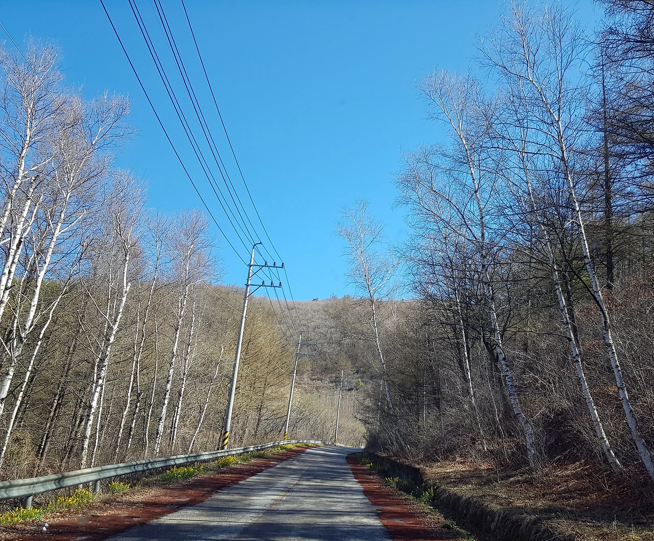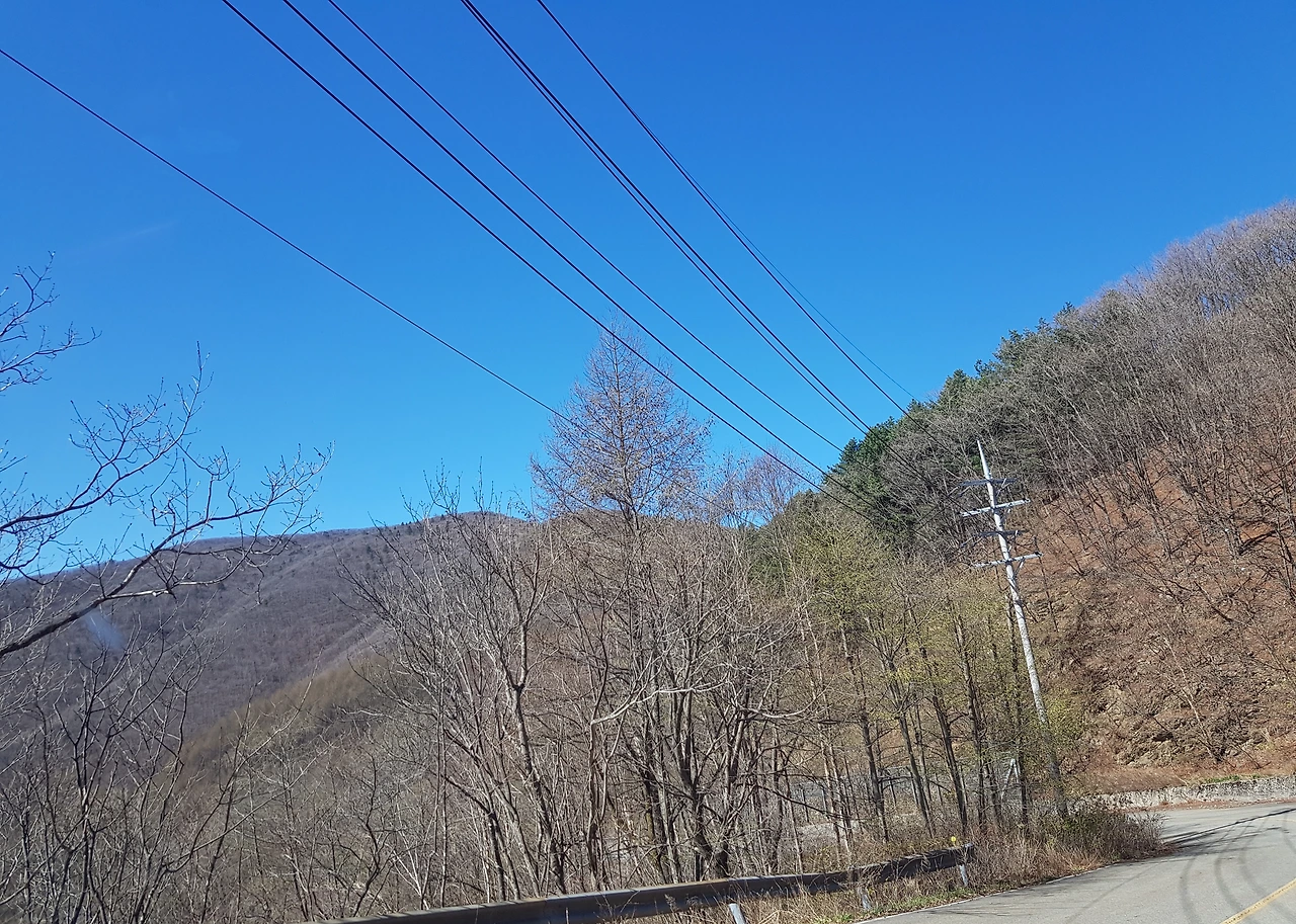 천천히 다시 꼬부랑 싸리제를 내려오는데 봄볕의 산들이 부드럽고 아름답게 보였으며 맞은편 산 위의 풍력 바람개비들이 바람에 돌고 있는 모습도 자연의 한 폭으로 보였다