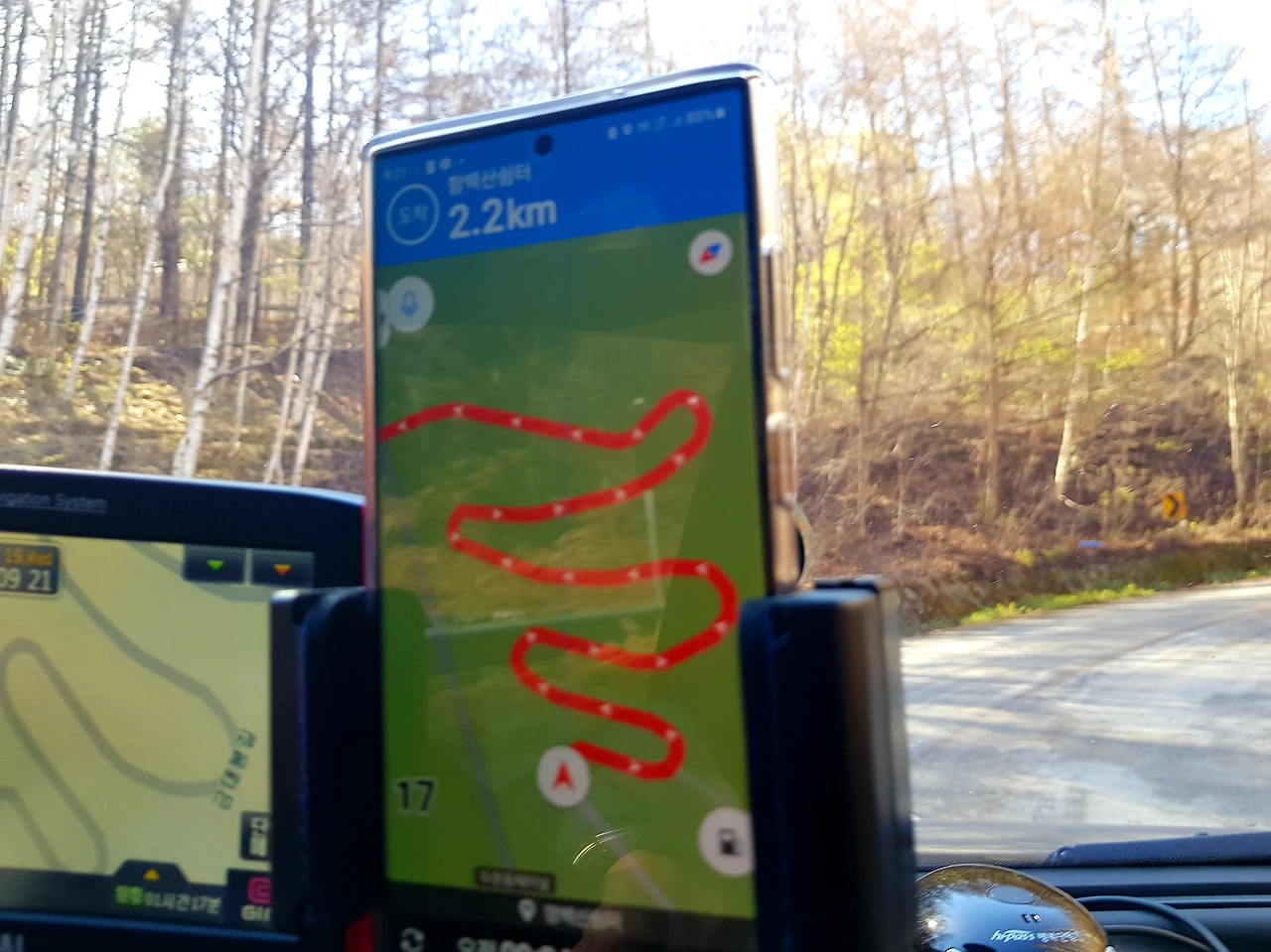 하얀 자작나무 숲이 정렬해 반기는데 내비에 떠 있는 길 안내가 심상치 않다