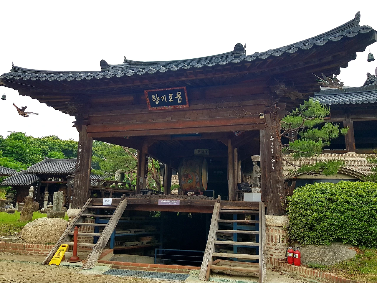 계단을 올라 루에 오르니 대북 옆에 나란히 북채 두 개 있어 손에 들고 대북을 두드린다