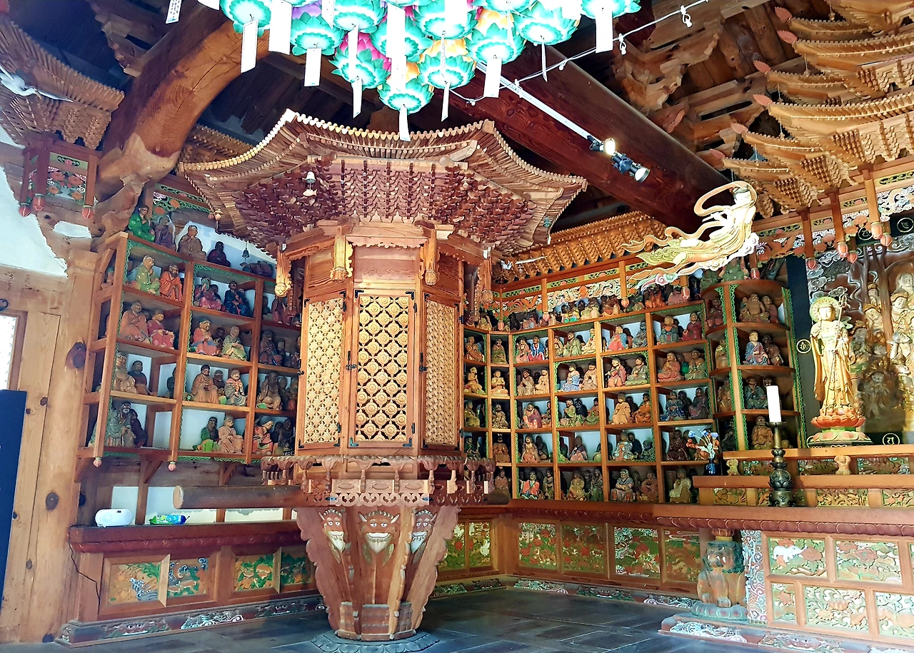 부처를 모신 단 위 지붕의 수없이 많은 추녀 끝은 하늘을 날 것처럼