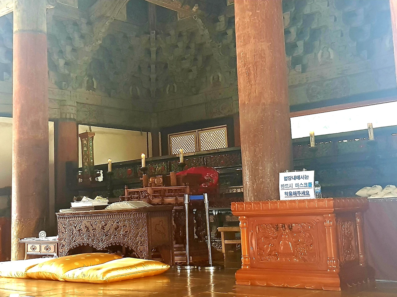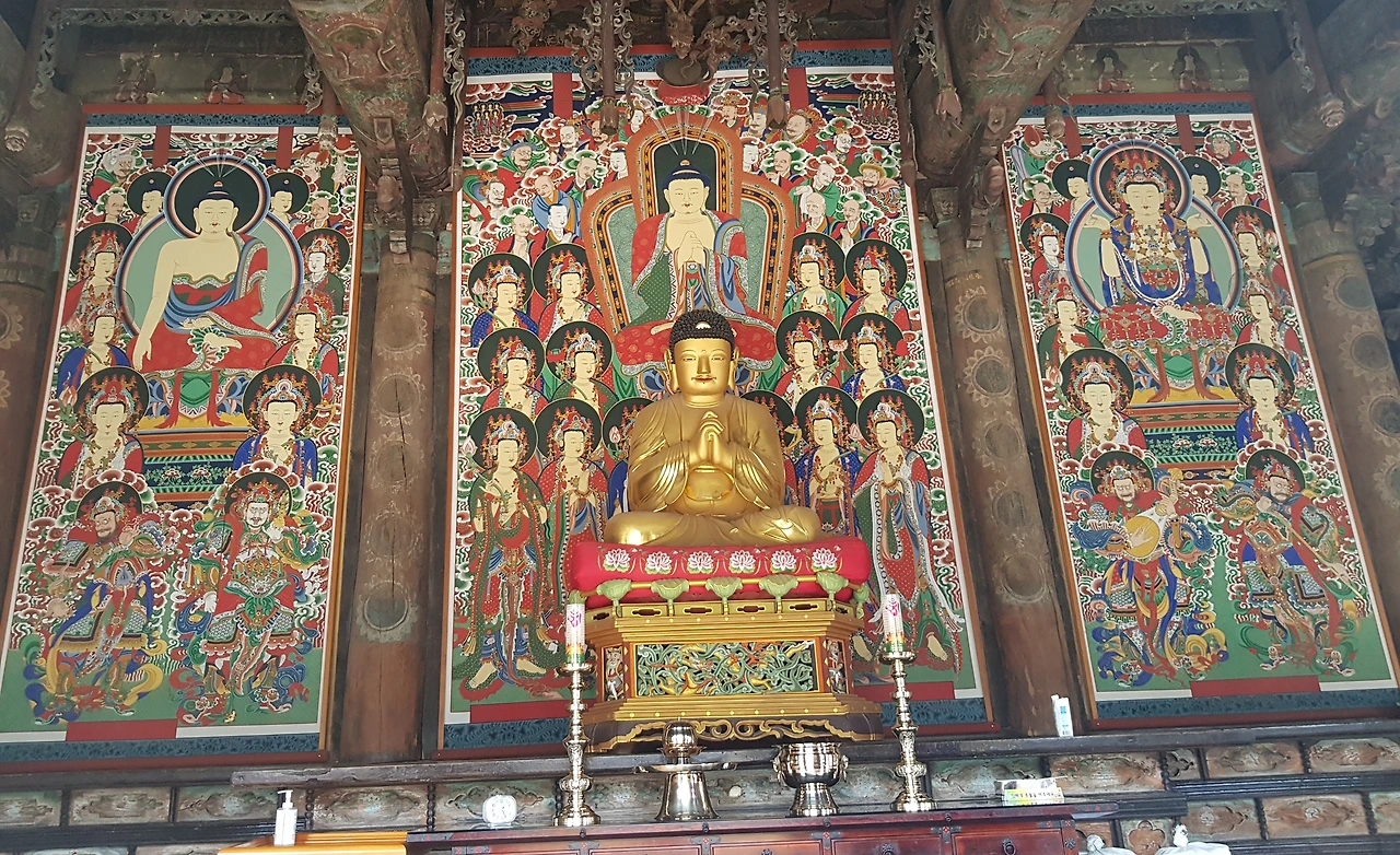 통도사는 삼보사찰 중 불보사찰인데 석가모니 부처님의 진신사리와 가사를 금강계단에 봉안하고 있기 때문이며 따라서 대웅전에 따로 불상을 모시지 않는다는 설명을 안내서를 통해 알고 나니 대웅전에 불상이 없고 높은 의자에 방석이 놓여 있어 의아했었는데 아! 그곳이 부처님 자리로구나 이해가 되었다