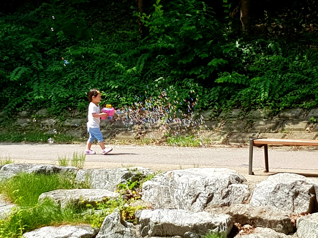 당당하게 전진하며 비눗방울을 쏘아대는 아이의 신난 걸음걸이