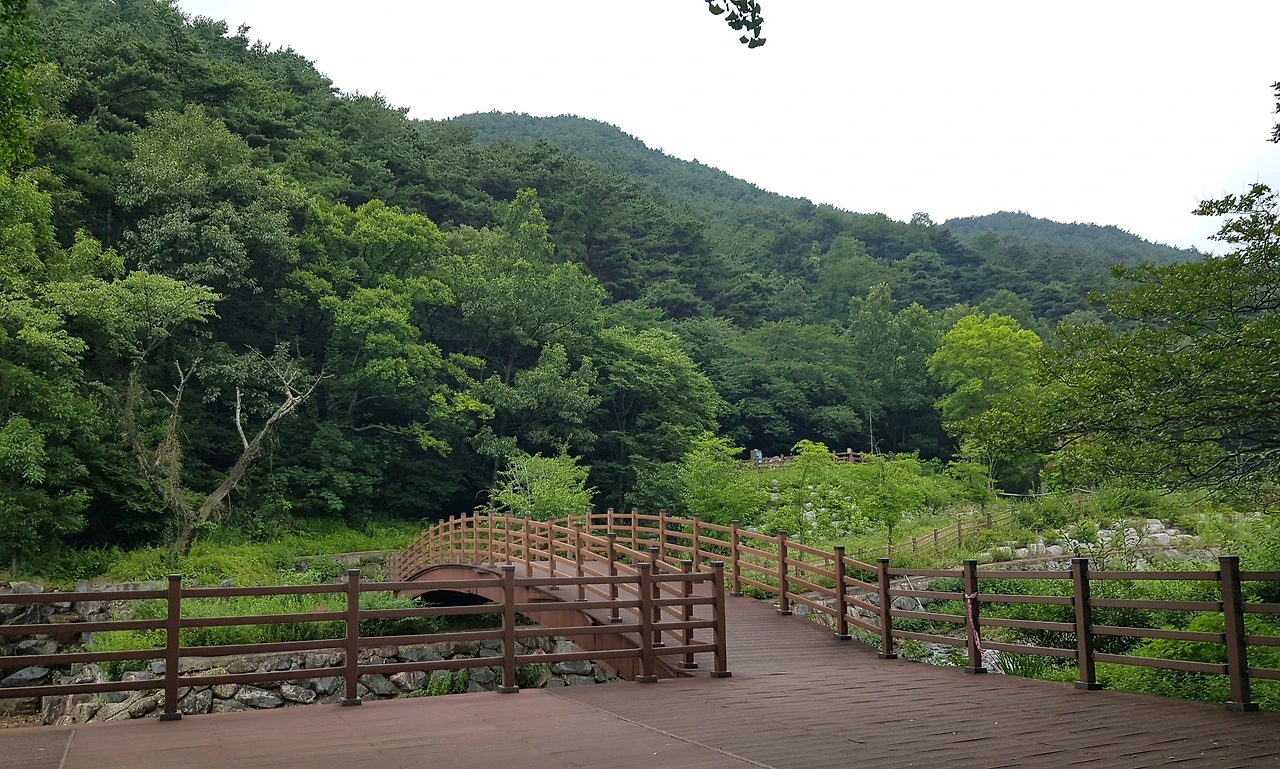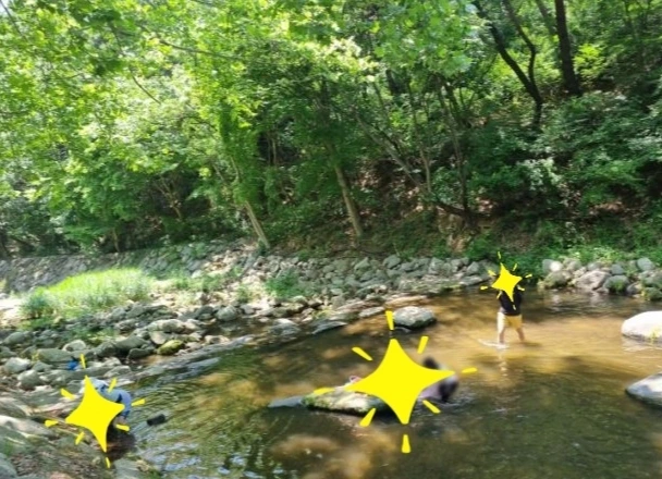 지나 데크에 들어서 바라 보이는 계곡 속 물놀이에 신이 나 있는 모습에 여행객은 부러워 빙그레 미소가 핀다