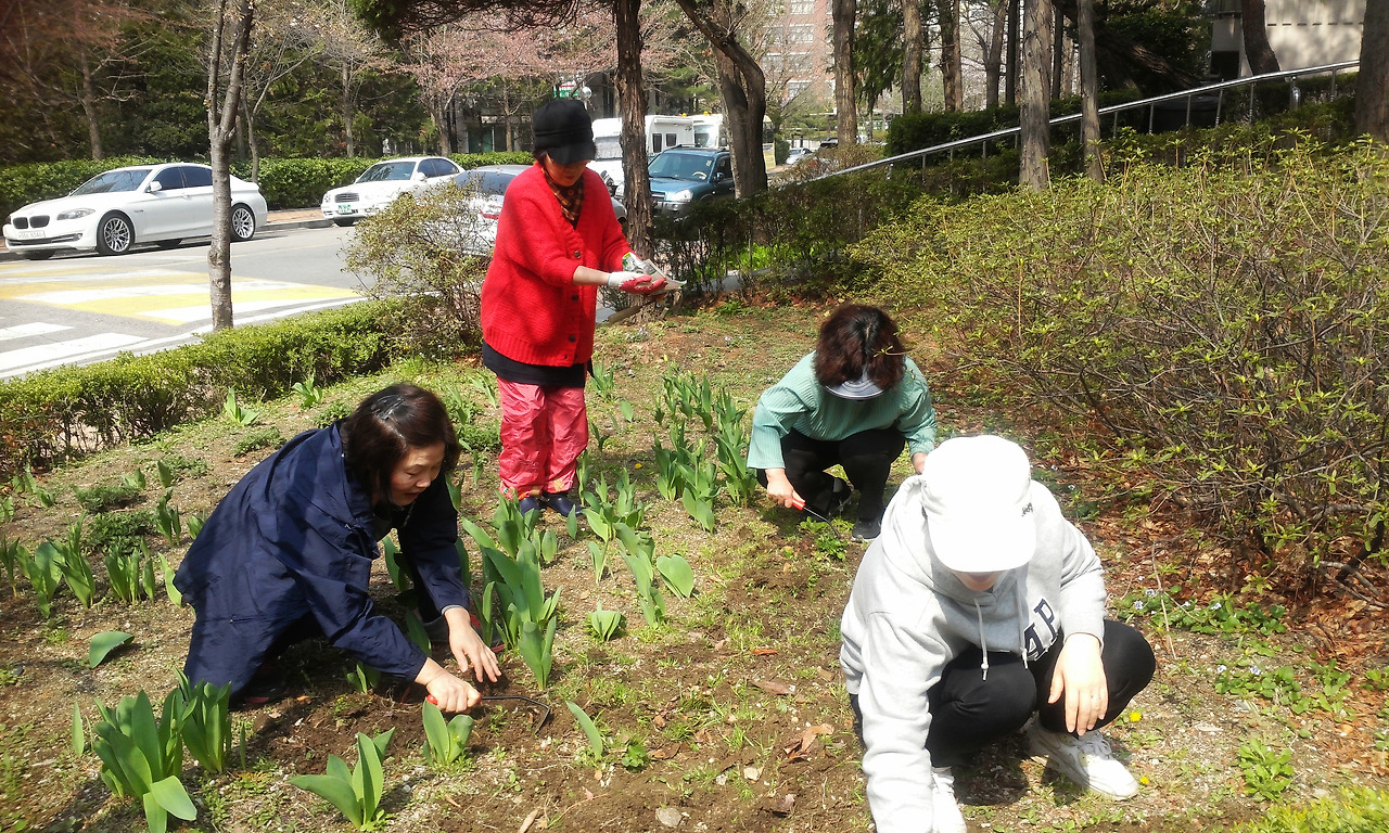 땅을 파고 풀을 뽑고 꽃씨를 뿌리며