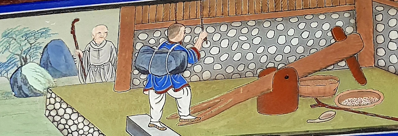 불법을 배우러 왔는데 방앗간으로 보내 아무 말없이 8개월 동안이나 방아를 찧게 했는데도 불평하지 않고 방아를 찧었던 청년