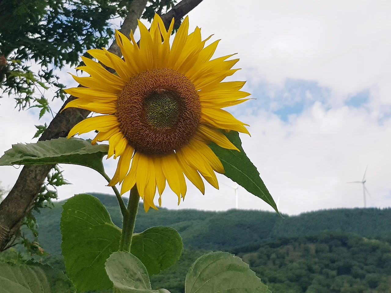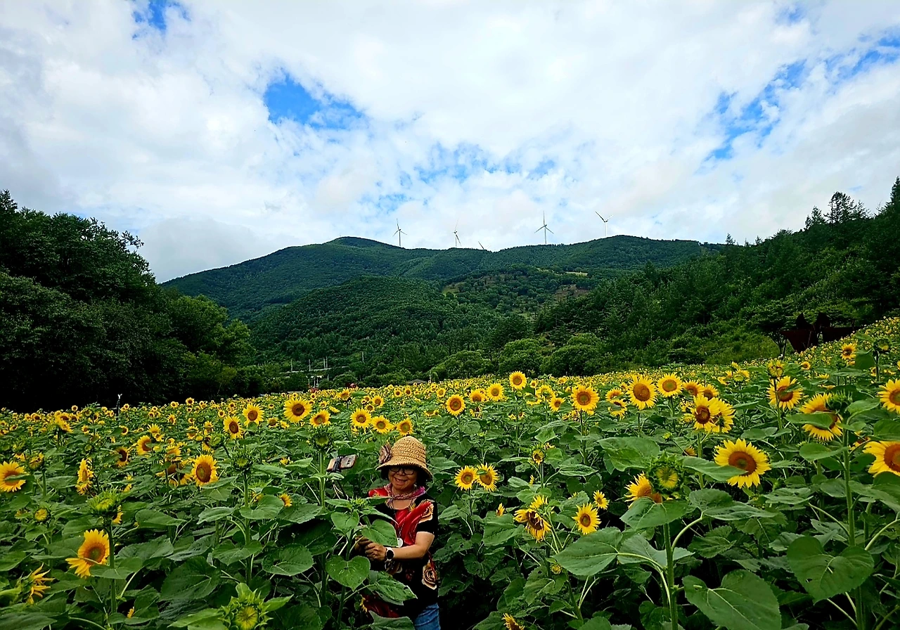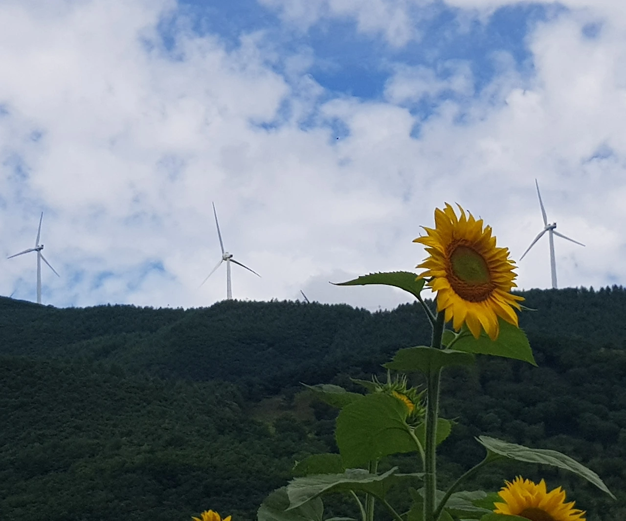 앞산 산등성이 작은?바람게비 빙글빙글 돌아가며 내려다 보고 축하보내고 있는 너무도 아름다운 해바라기 축제 ㅡ