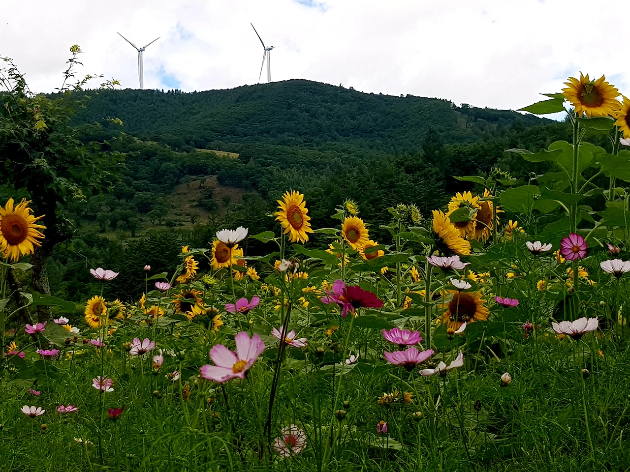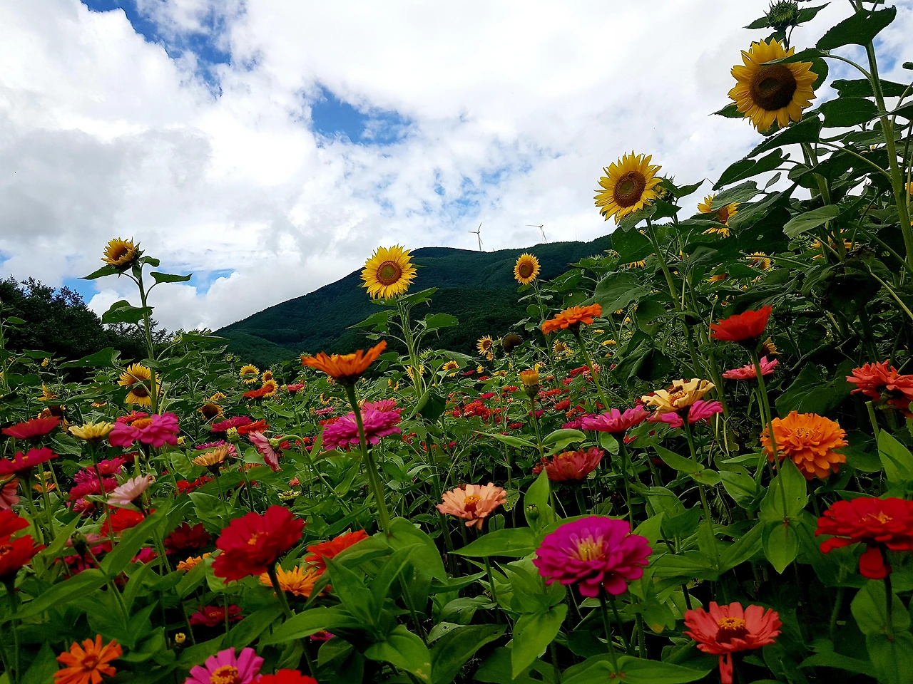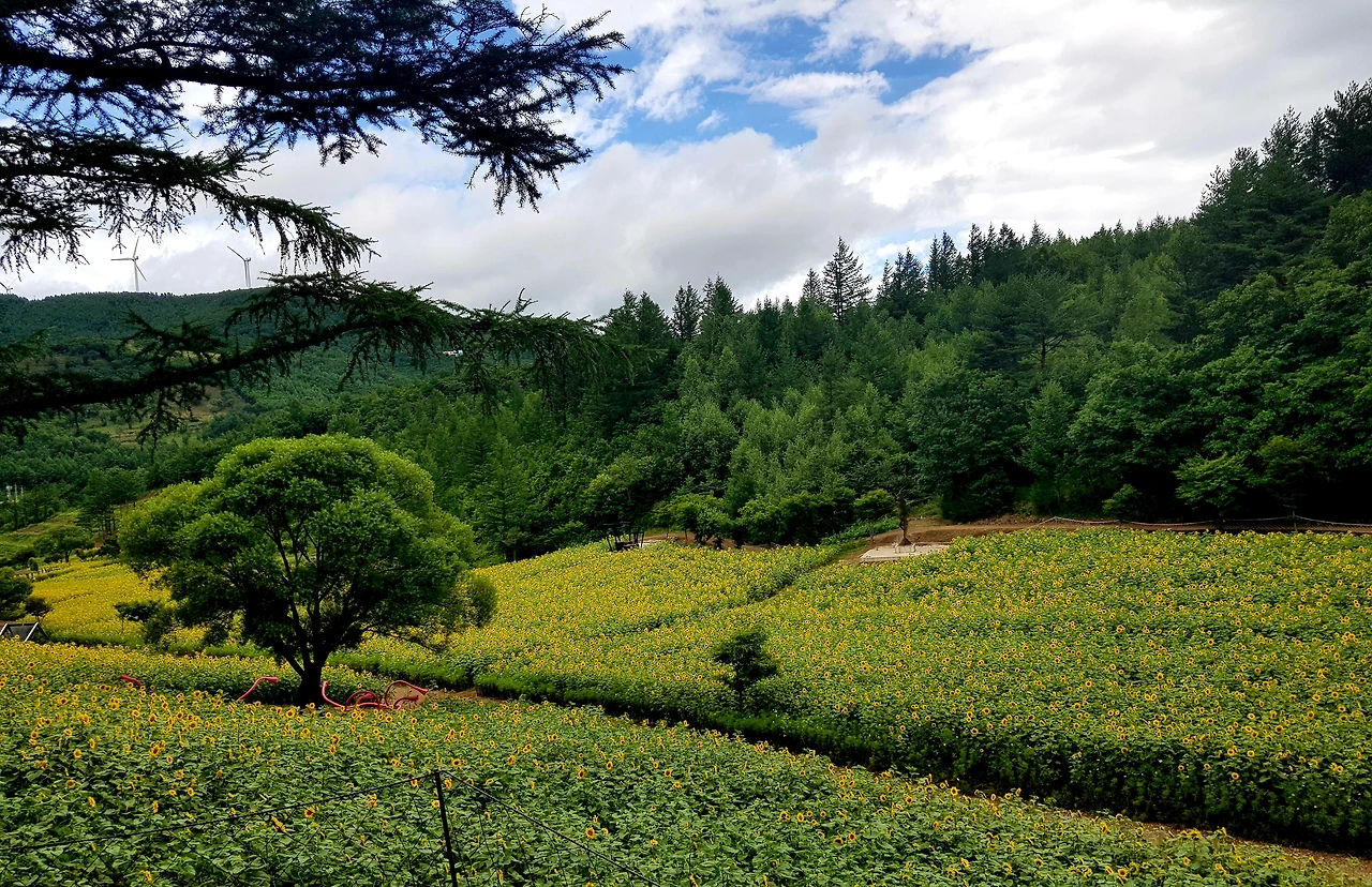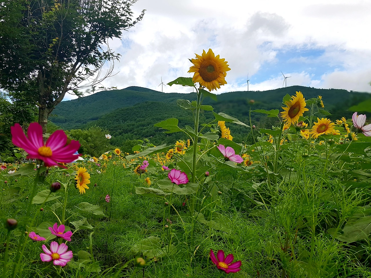 앞산 산등성이 작은?바람게비 빙글빙글 돌아가며 내려다 보고 축하보내고 있는 너무도 아름다운 해바라기 축제 ㅡ