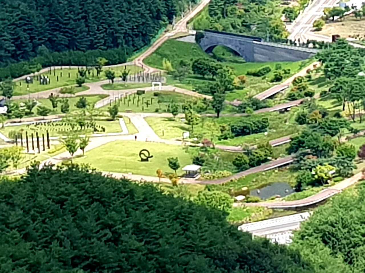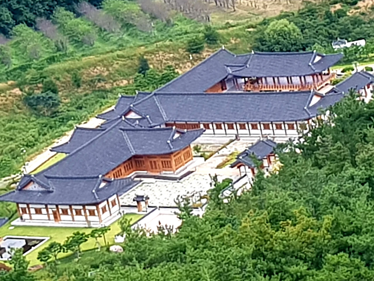 산들이 겹치고 겹쳐 마치 물결을 흐르는 듯하고 태권도원의 부속 건물들과 가꾸어 놓은 정원도 눈에 들어왔다