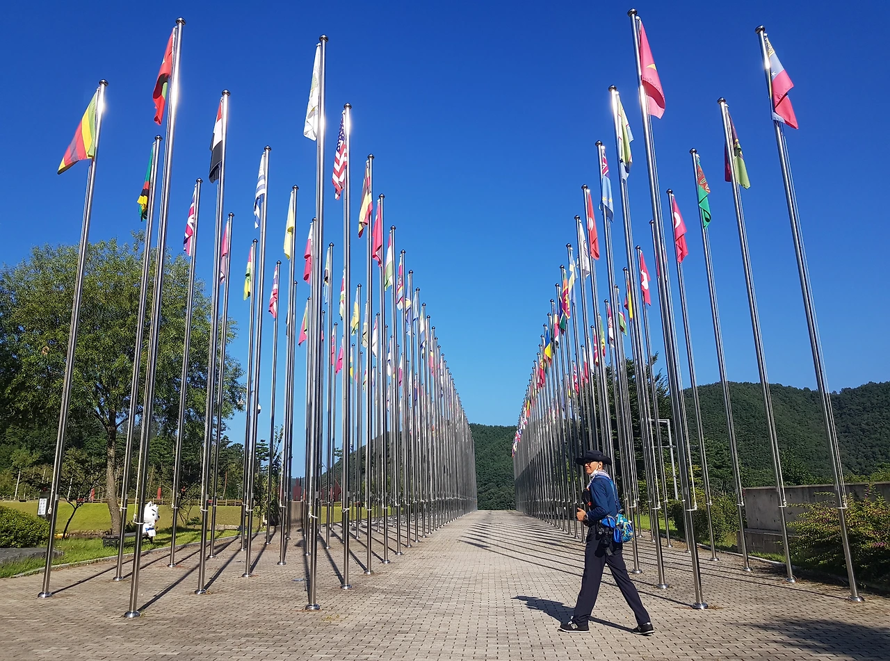 만국기와 조각품이 있는 길을 지나 저 위의 주차장에 내려보니 9시 시작인 줄 알고 왔는데 10시 관람시작이라고 ㅡ