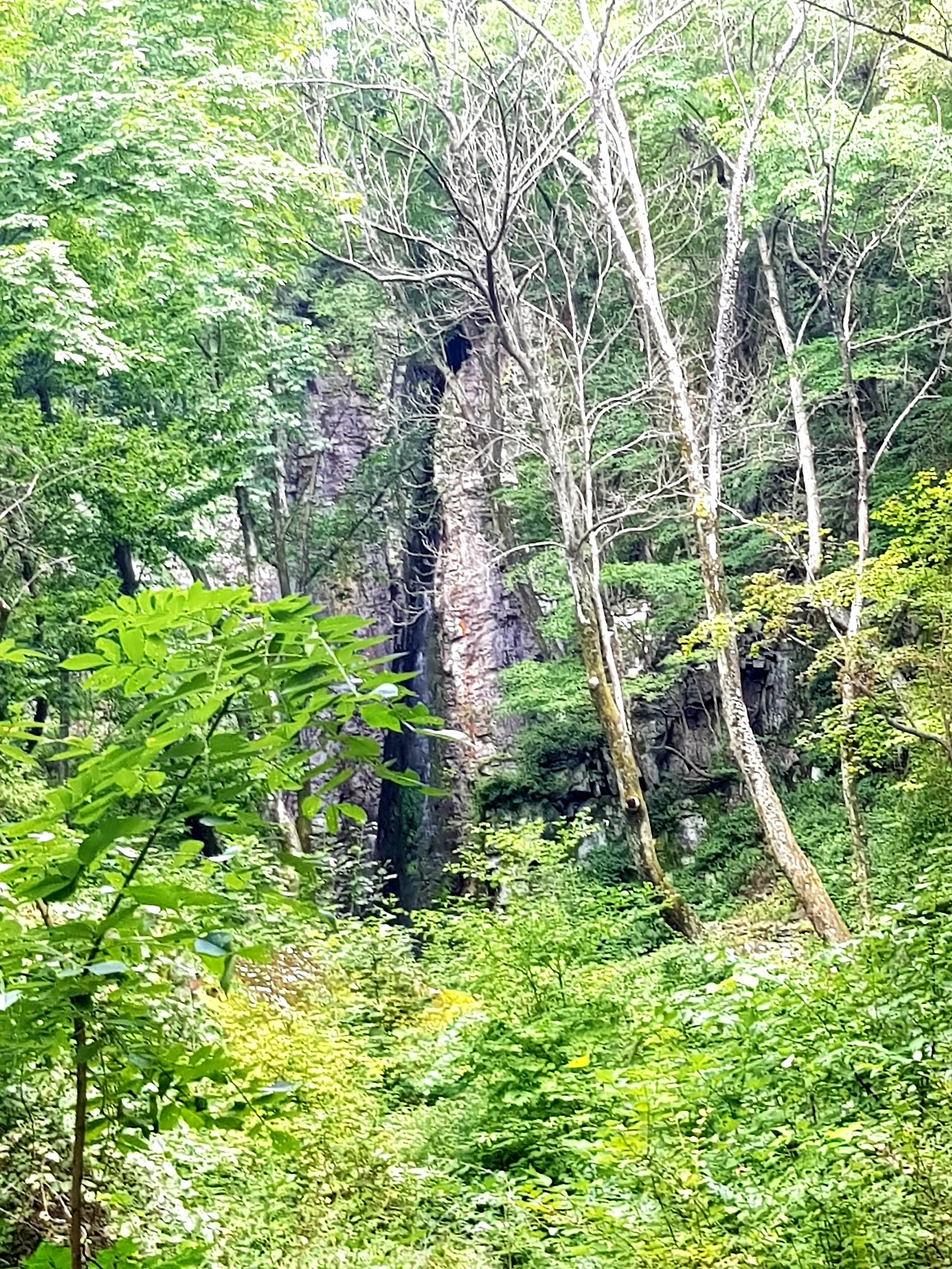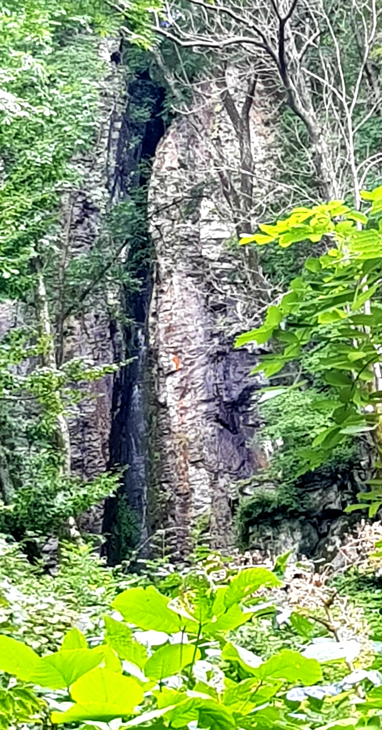 우리가 꼬부랑길을 많이도 올라왔는데 폭포 뒤의 산과 저 높은 바위인데 저 물줄기는 도대체 어디로부터 흘러나오고 있는 것일까