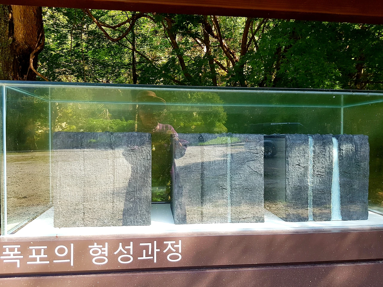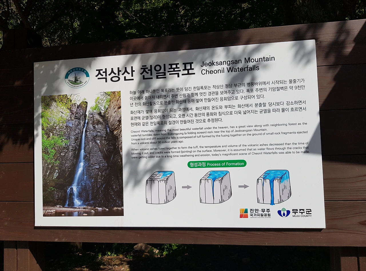 적상산 정상을 향해 오르다 와인동굴을 거쳐 다시 한참을 오르고 있는 길가에 천일폭포를 알리는 이름표가 있어 따라 들어가 보니 주차장이 있고 천일 폭포의 생성과정을 안내하고 있었다