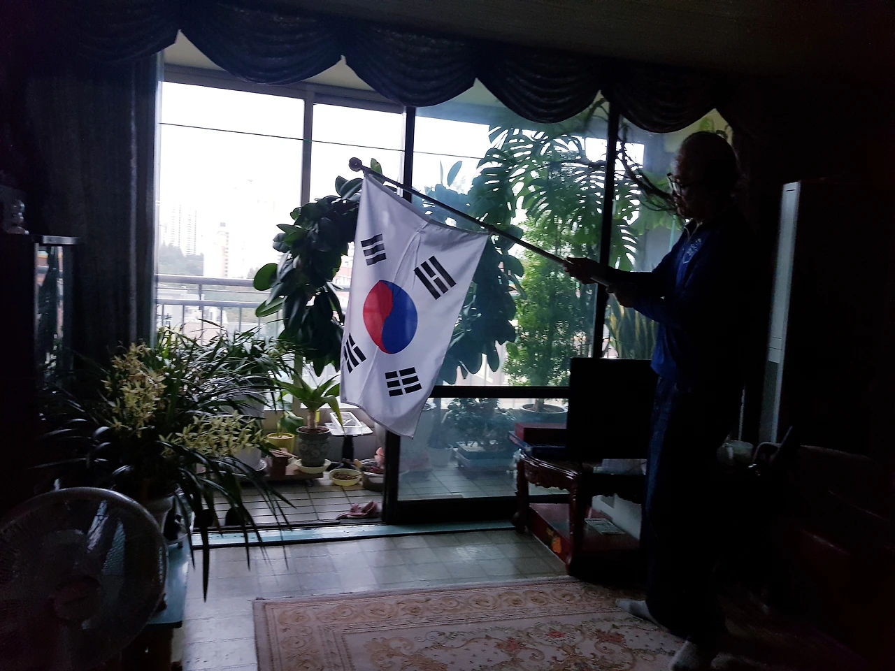 아침 일찍 태극기를 발코니에 내 거는