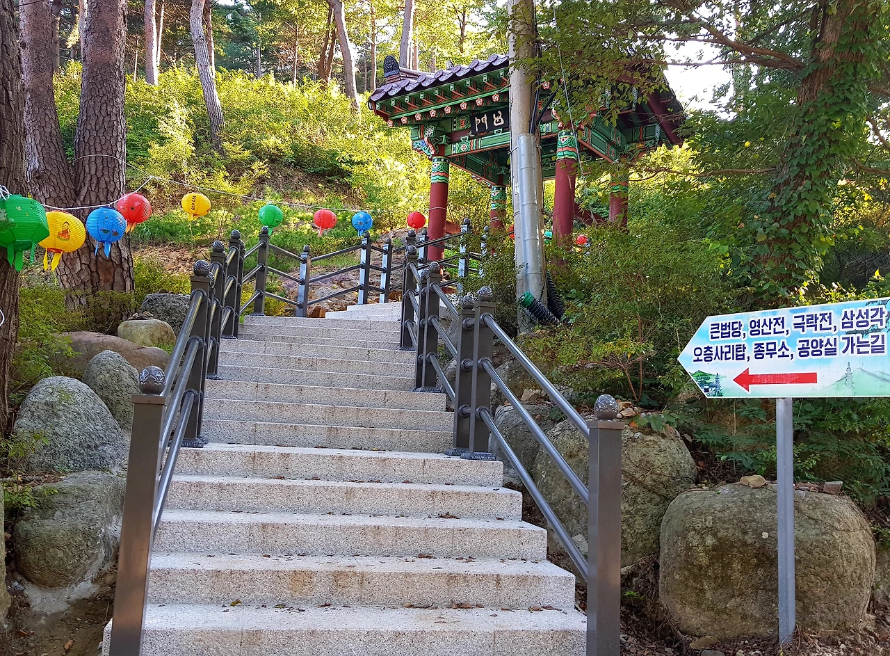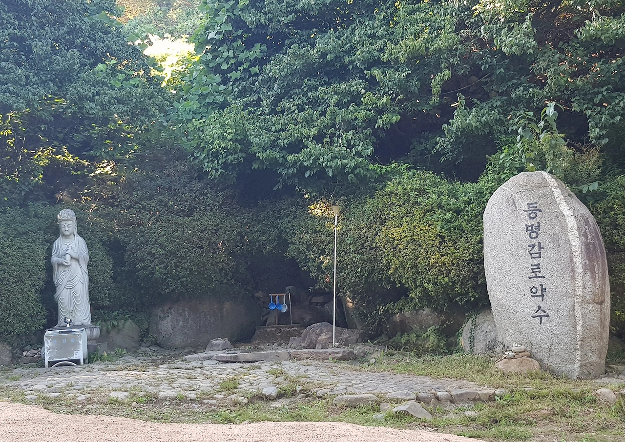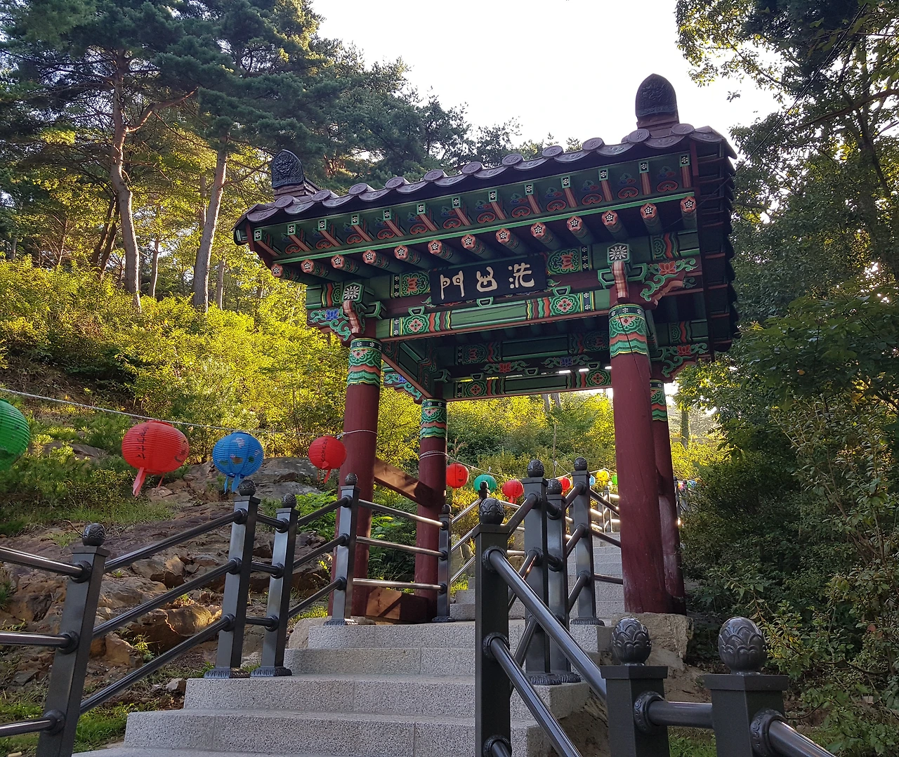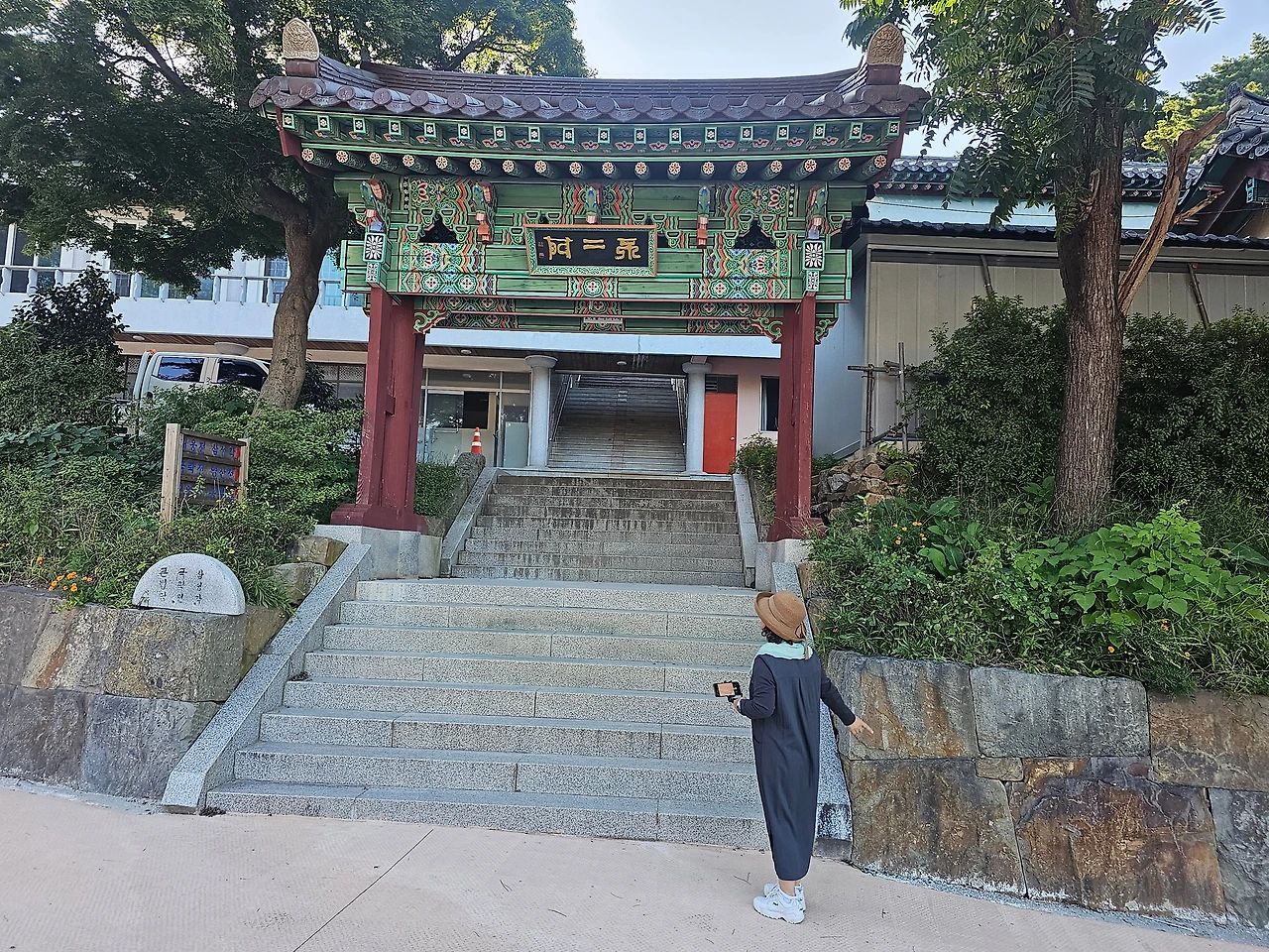 일주문을 지나 들어가니 동명감로약수터가 있었고옆으로 잘 꾸며진 구부러진 계단을 오르자 세출문이 있었다