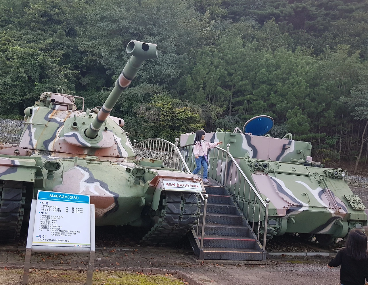 전시장을 살펴보고 밖으로 나와 탱크와 전차의 전시품을 돌아보는데 할머니와 같이 온 꼬마숙녀가 계단을 오르더니 외친다