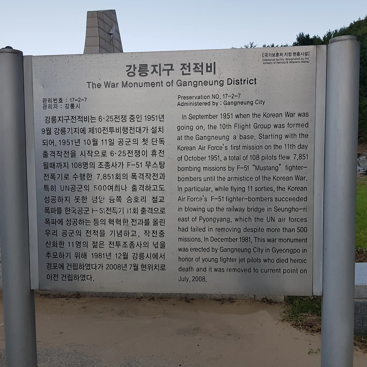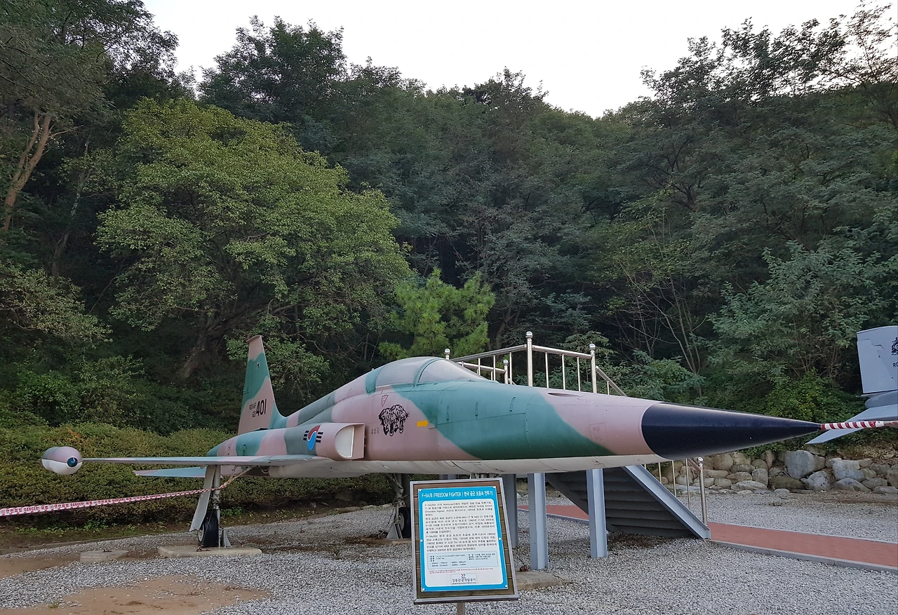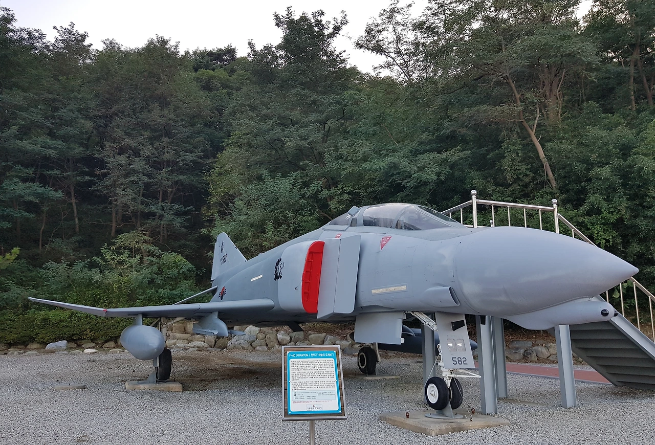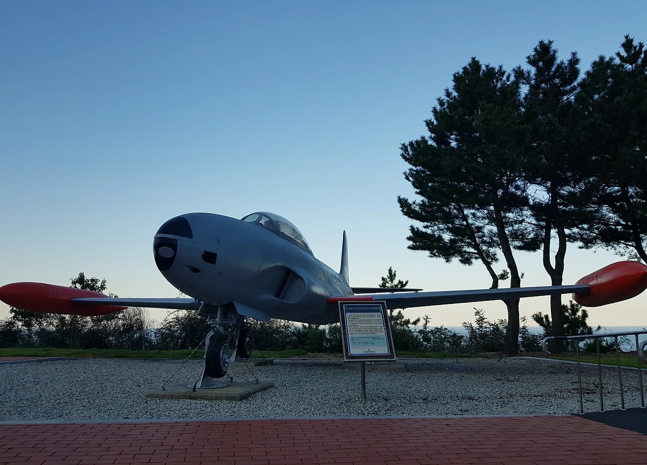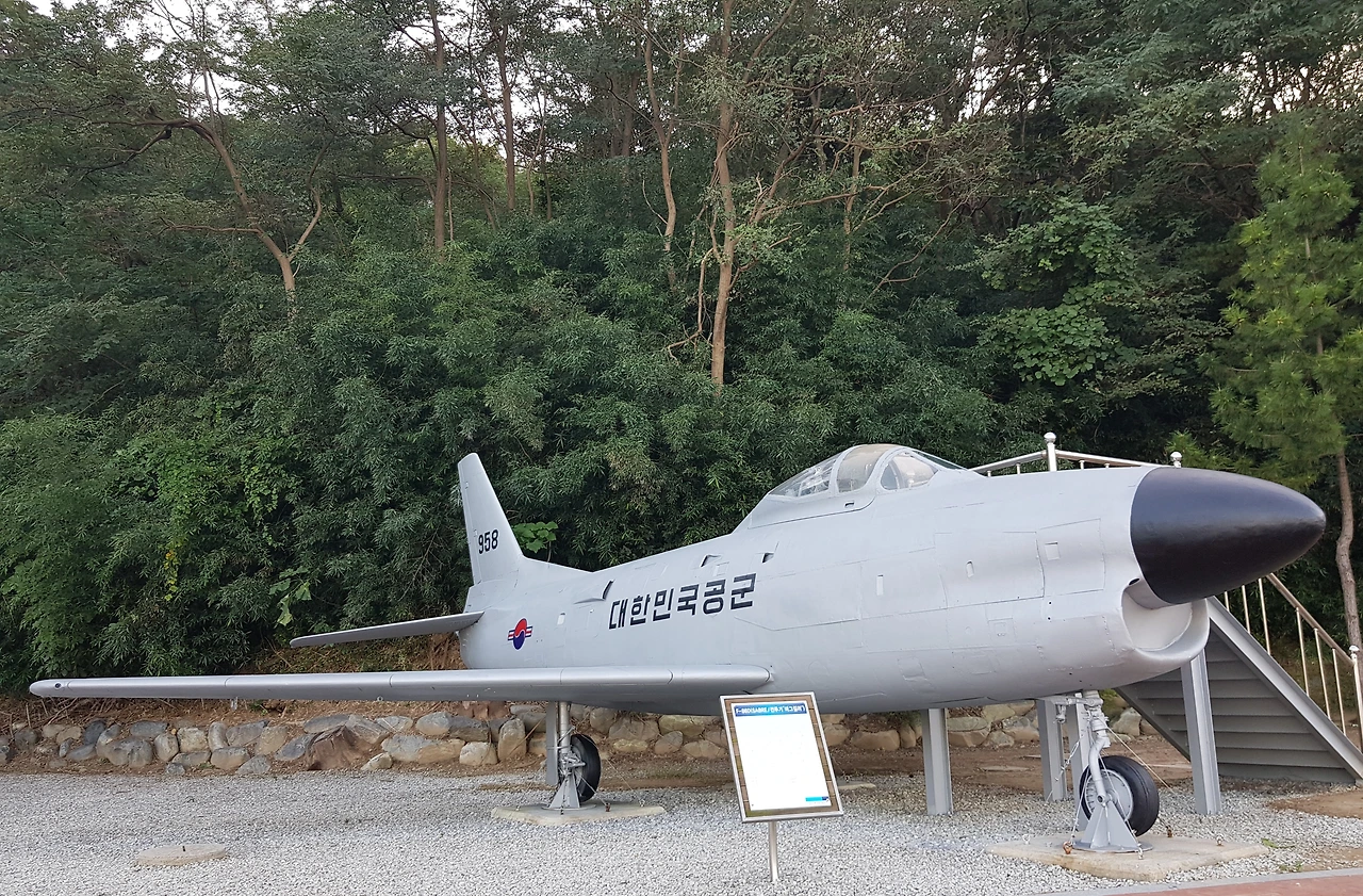전투에 참여했던 비행기들이 전시되어 있고 안쪽으로 강릉지구 전적비가 있었는데 6.25 전쟁 중인 1951년 9월 강릉기지에 제10 전투 비행전대를 설치 1951년 10월 공군의 첫 단독 출격 후 6.25 전쟁이 휴전이 될 때까지 많은 공을 세웠으며 특히 미군이 수백 차례의 출격에도 이루지 못했던 평양 동쪽 승호리철교를 11회 출격으로 폭파에 성공하는 등 수많은 전과를 올린 공군의 전적을 기념하고 작전중산화한 11명의 젊은 전투조종사들의 넋을 추모하기 위한 위령탑을 건립하였다고ㅡ
