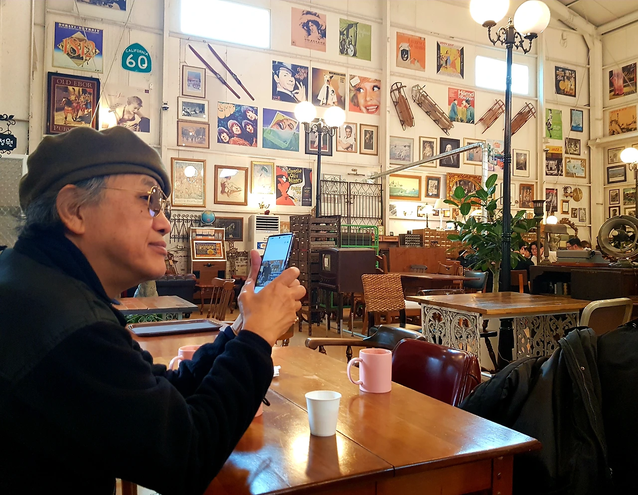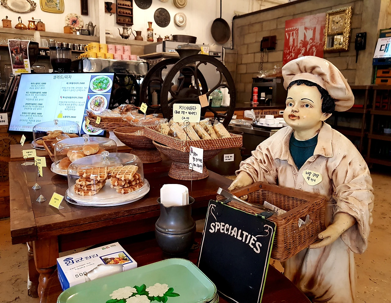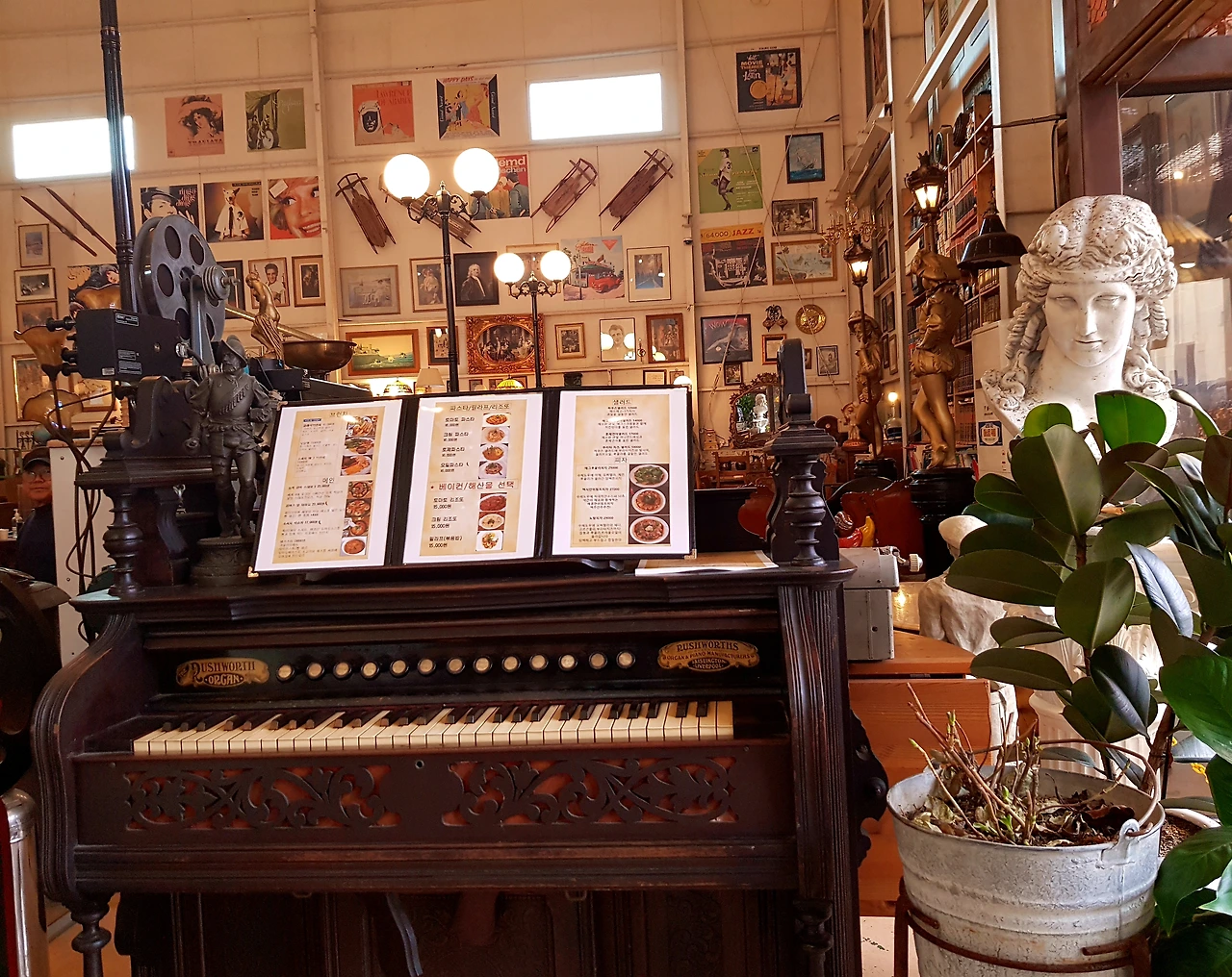 벽에는 외국배우의 사진과 포스터 그리고 여러 조각상과 고양이가 주인 되어 앉아있는 마차등 뭔가 무질서 속의 질서를 느끼며 노랑공장 실내로 들어갔다