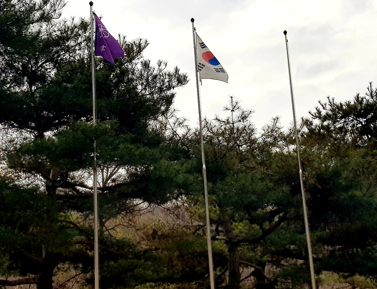 옆으로 세 개의 깃대에 태극기가 펄럭이고 국궁을 나타내는 깃발인가 싶은 깃발이 펄럭이고 하나의 깃대는 우두커니 옆의 깃발이 부러운가 보다