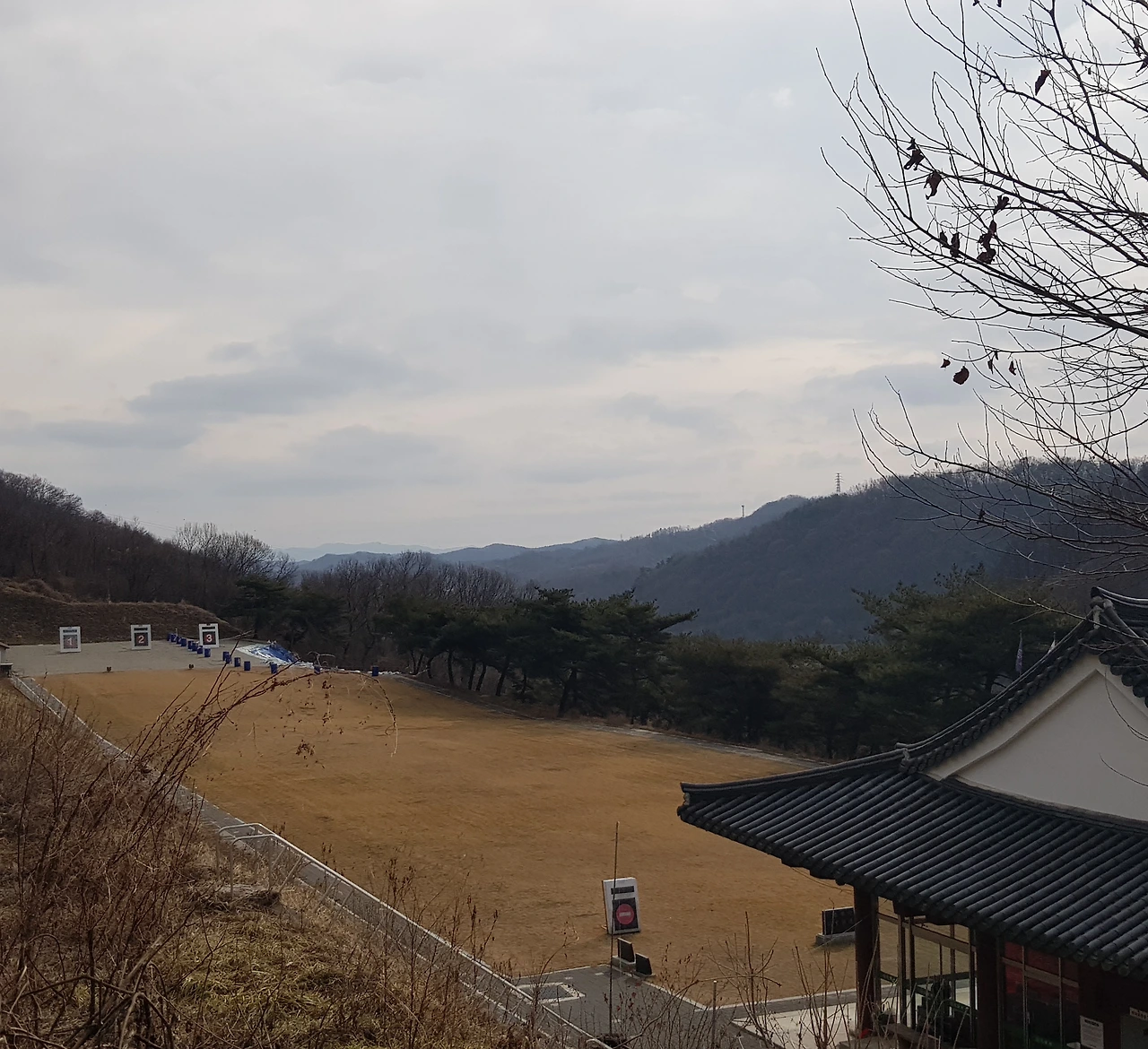 길가에서 내려다보니 국국장이어서 갑자기 화랑들의 활쏘기가 떠올라 들어가 보기로 하고 옆길로 들어서니 얼었다 녹아 질퍽한 옆마당을 돌아가니 국궁활 터였다