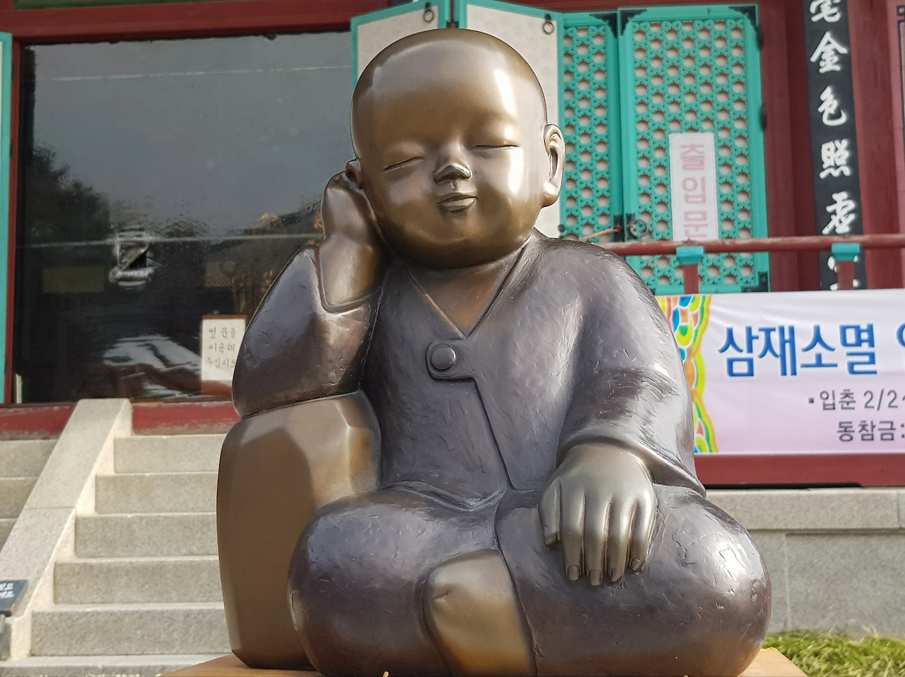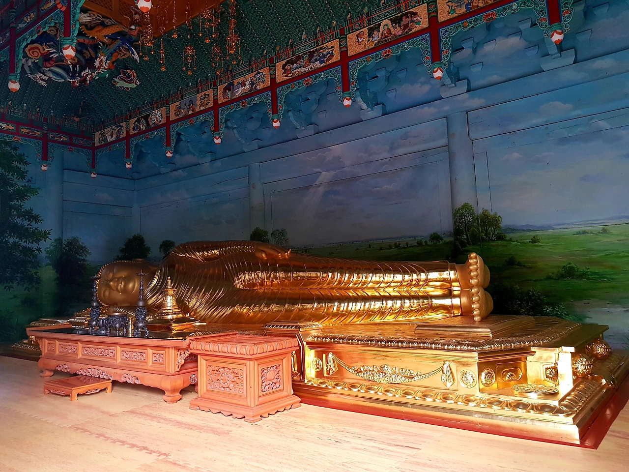 멋지게 꾸며놓은 동산을 돌아가다 적조전의 문이 열려 있기에 들여다보니 번쩍번쩍 빛나는 황금 빛 거대 와불이 모셔져 있었다