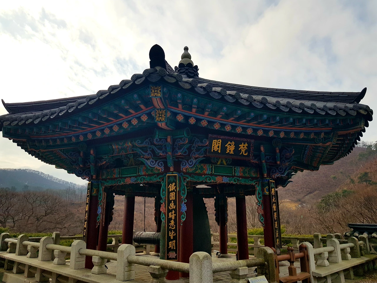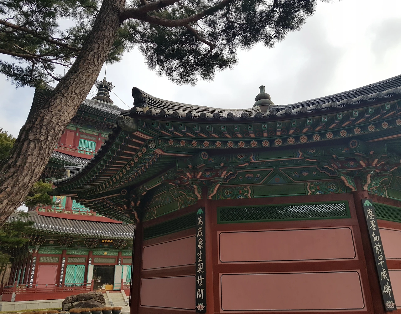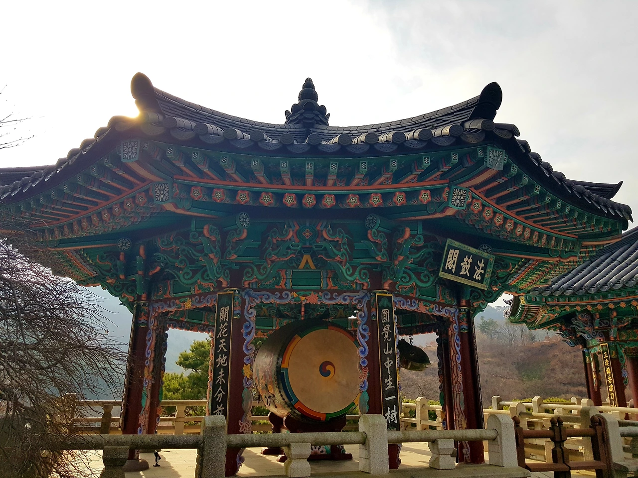 감탄을 하며 계단을 오르자 7각의 범종각과 9각의 법고각이 양옆으로 균형을 이루며 아름다움을 뽐내고 있었고 정면에는 삼국시대 목탑건축의 전통을 잇는 3층 목탑이 우뚝 서 있었다