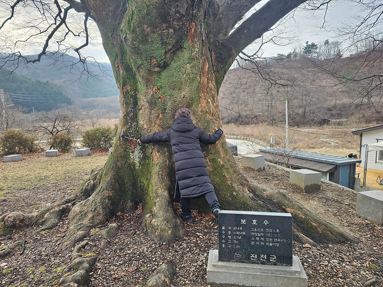산간 마을이니 고인돌이 있기도 하겠지 라며 느티나무에 다가가 팔을 둘러보니 그 둘레가 양팔을 벌려 다섯 번을 넘기는 크기였다