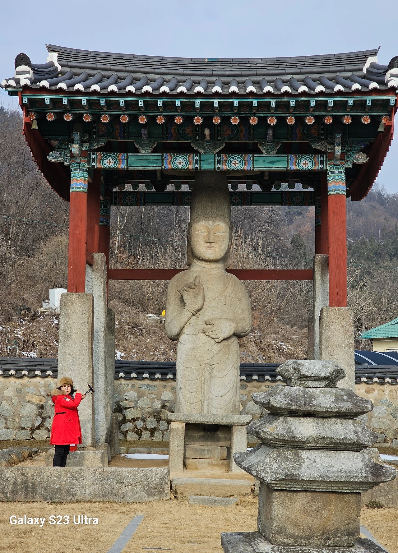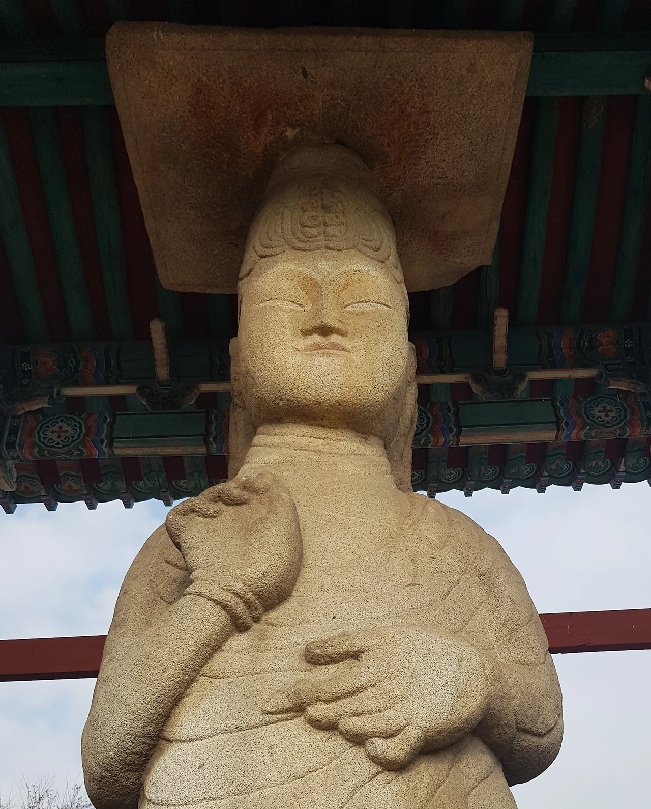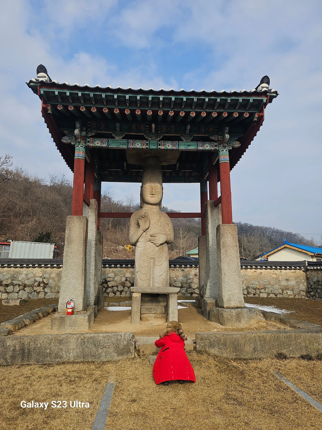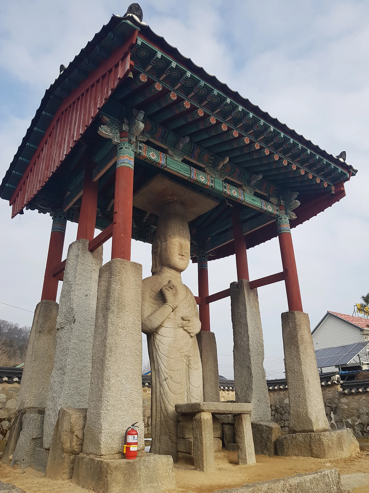 크고 미륵당에 들어서 있어 가까이에서는 한컷으로 크게 잡을 수 없어 몇 컷으로 나누어 촬영을 했는데 큰 머리와 상하체의 비율, 양손의 모양이나 그 생김이 왜인지 좀 언밸런스한 것 같은 느낌이었지만 발끝까지 내려온 가사의 주름선이 아름답다
