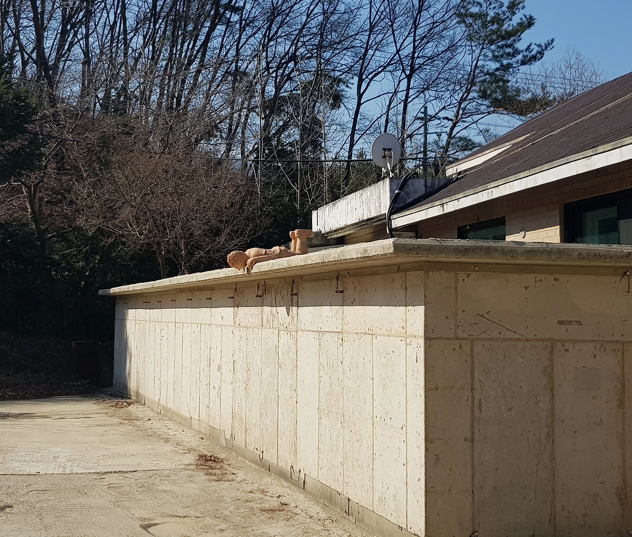 또 한 녀석 낮은 지붕 깔고 엎드려 담장 밖을 내려다보고 있다