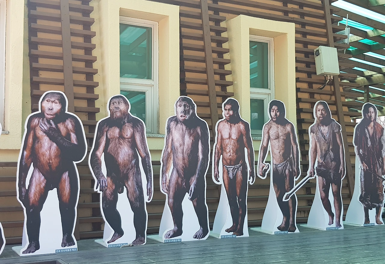 어찌 됐건 유인원 즉 원숭이가 사람으로 변해가는 모습을 박물관 앞에 세워 놓았는데 누가 뭐래도 종의 변천사에 원숭이가 인간이 되었다는 학자가 누구 건 절대 믿을 수 없다