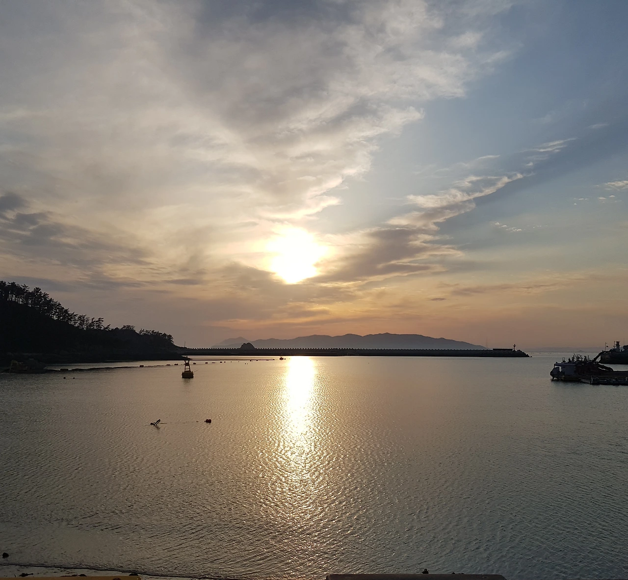 낙조가 내리는 바다를 보며 숙소에 짐을 푼다