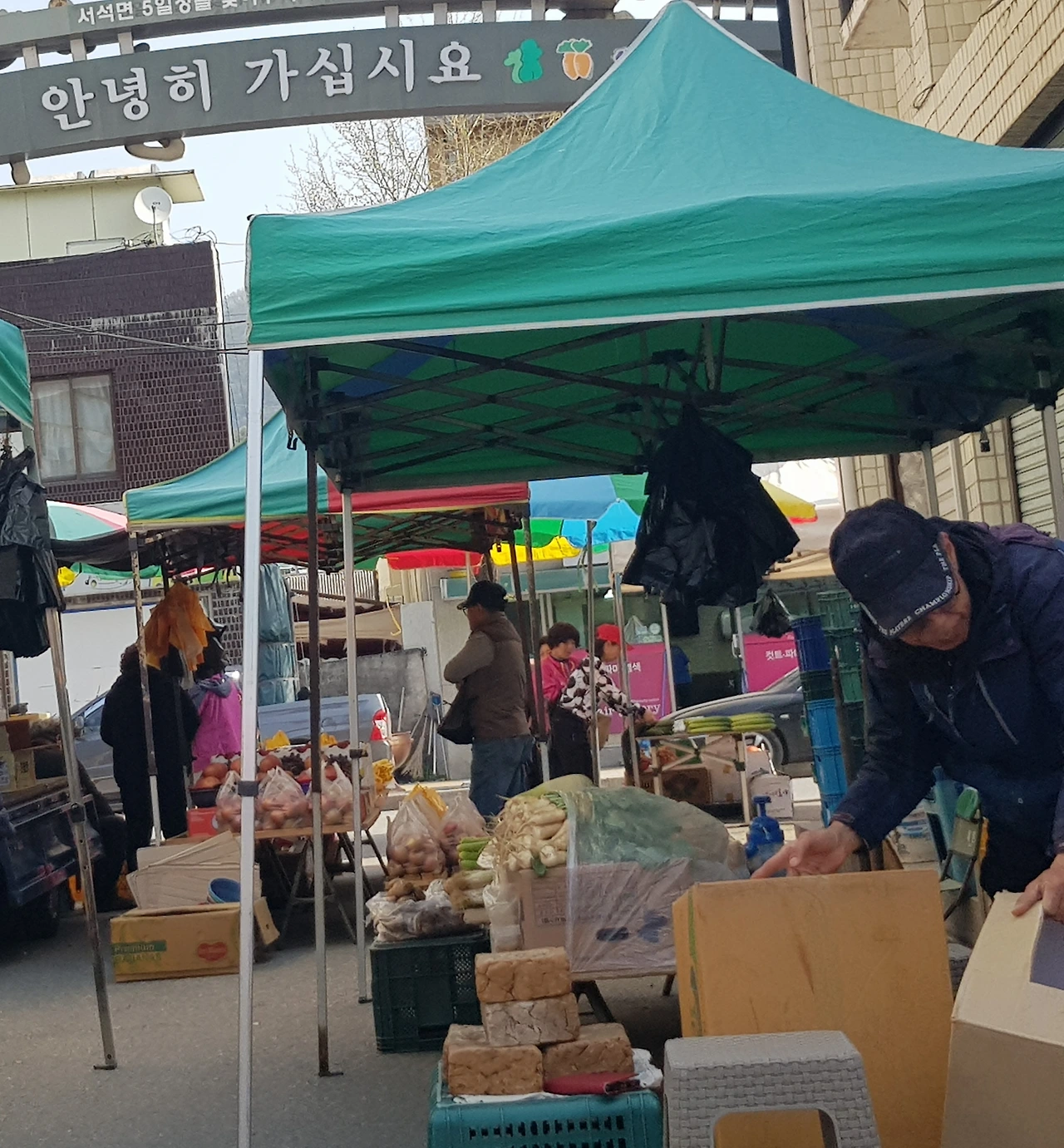 서석 전통 장터라는 하늘 위 간판이 우리를 반기고 있었고 오늘 팔 물건을 정리하느라 바쁜 상인들의 모습이 분주하다