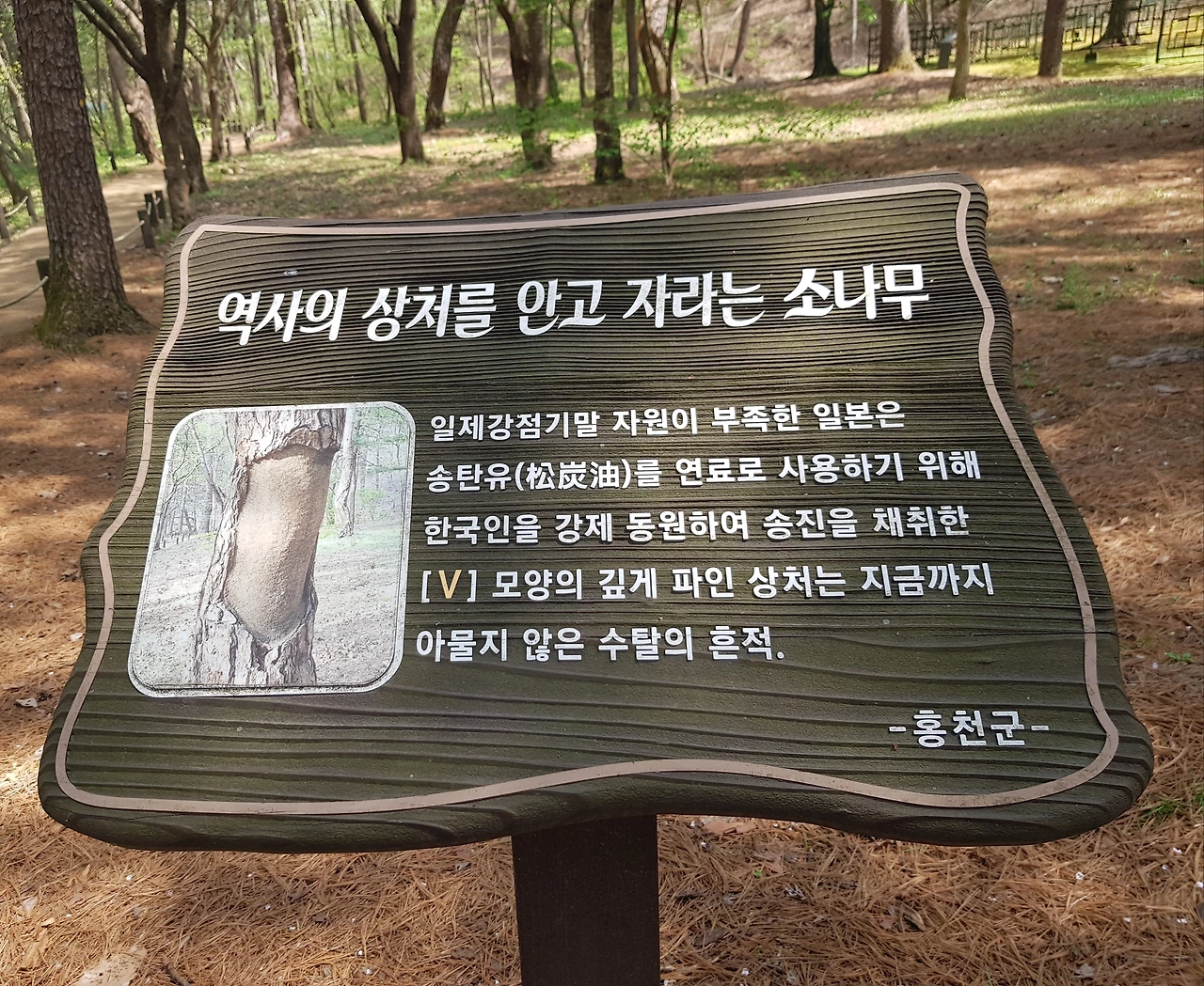 자원이 부족한 일본은 송탄유를 쓰기 위해 한국인을 강제 동원하여 송진을 채취하기 위해 깊이 파인 상처라는 것 ㅡ