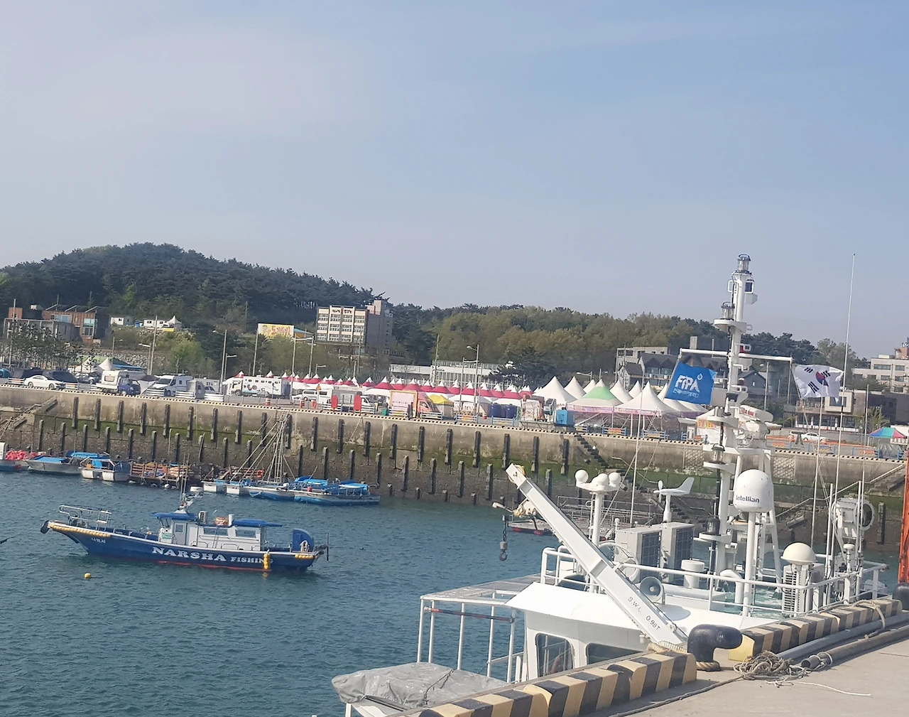 일하고 있는 배들 그리고 바다 가운데 떠있는 두 개의 작은 섬이 푸른 하늘과 어우러져 아름다웠다
