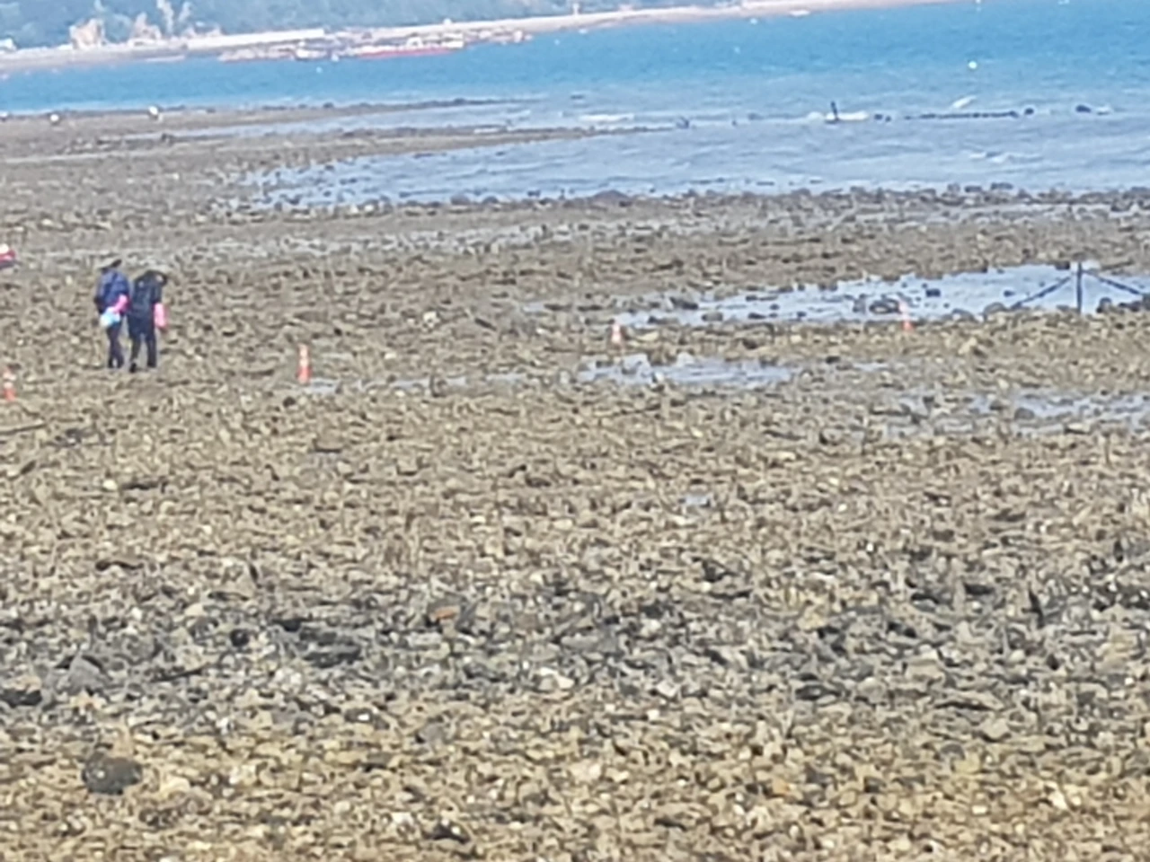 갯벌이 아닌 돌들이 펼쳐진 바닷물 가까이에 무언가 잡으려는 사람들이 있었는데 물이 빠지기를